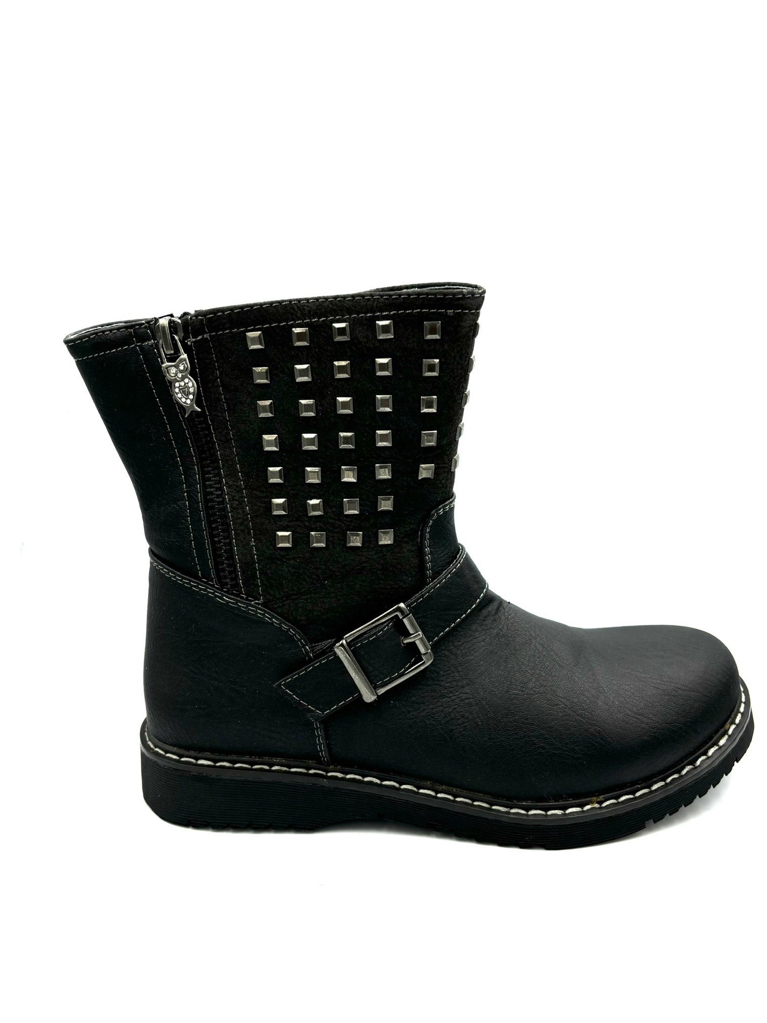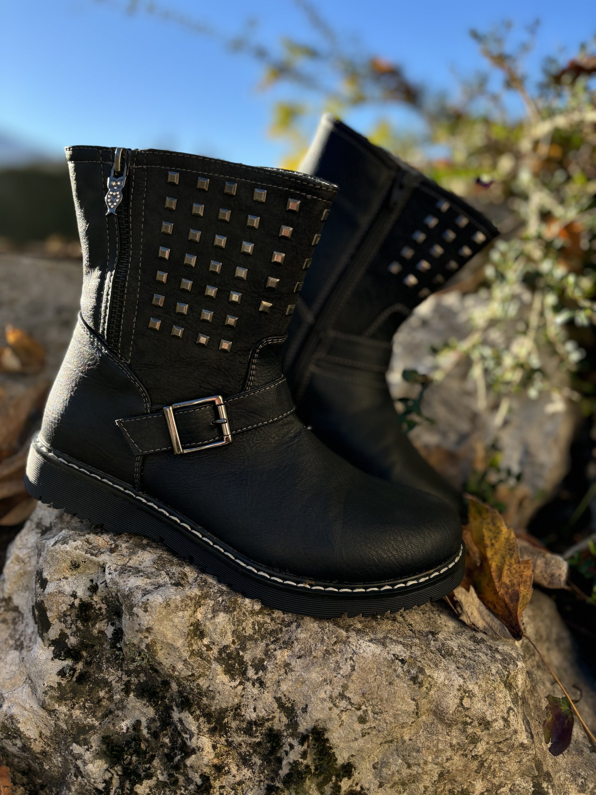 stivaletto con cerniera interna e borchiette che impreziosiscono la scarpa. Leggera, pratica e veloce. Alzata suola 2,5cm.