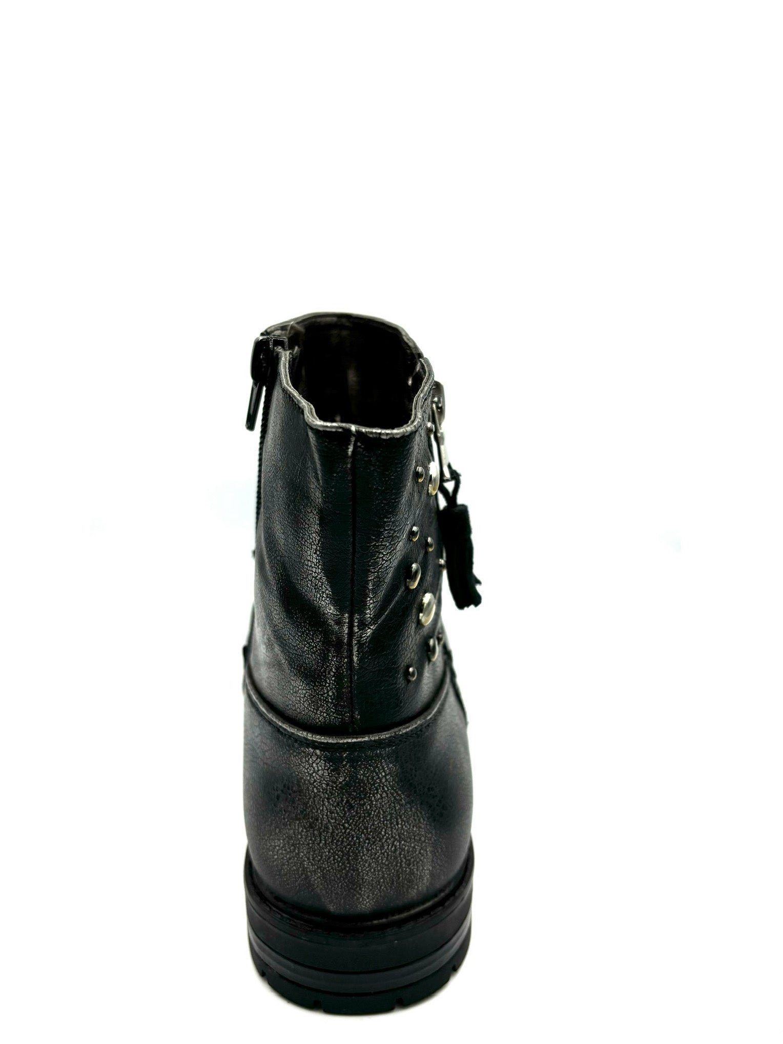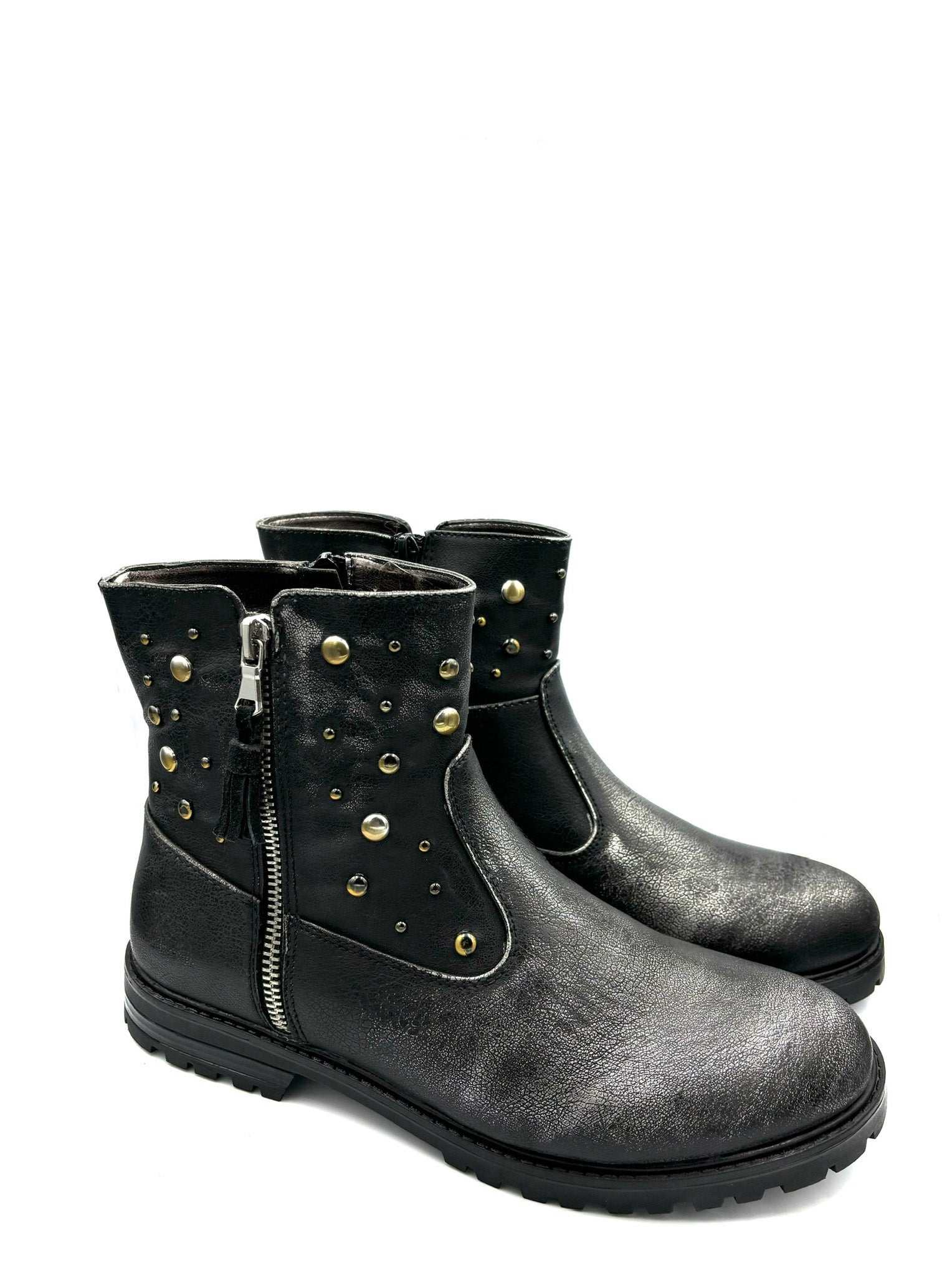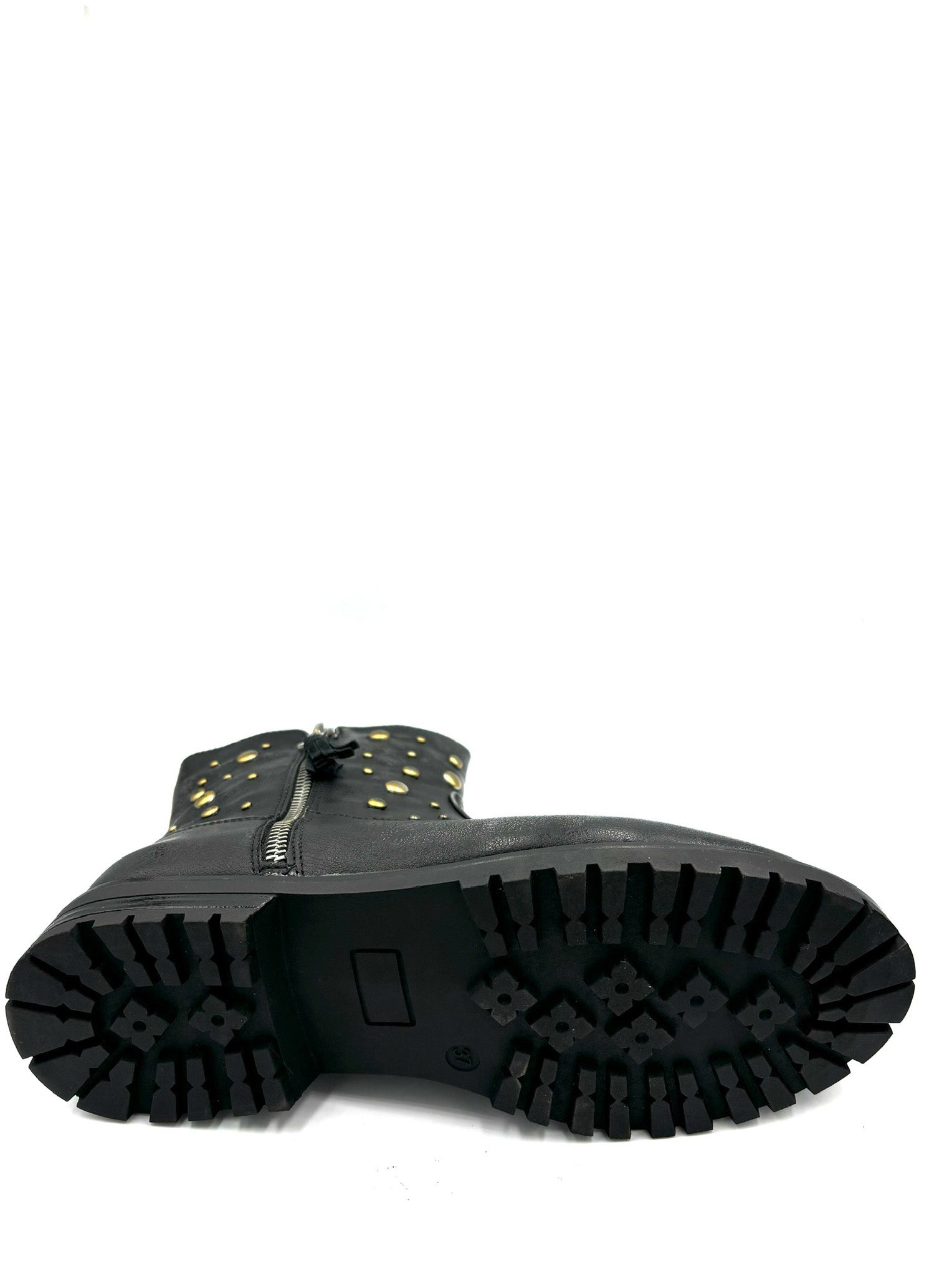 stivaletto con cerniera interna e borchiette che impreziosiscono la scarpa e cerniera finta esterna. Leggera, pratica e veloce. Alzata suola 2,5cm.