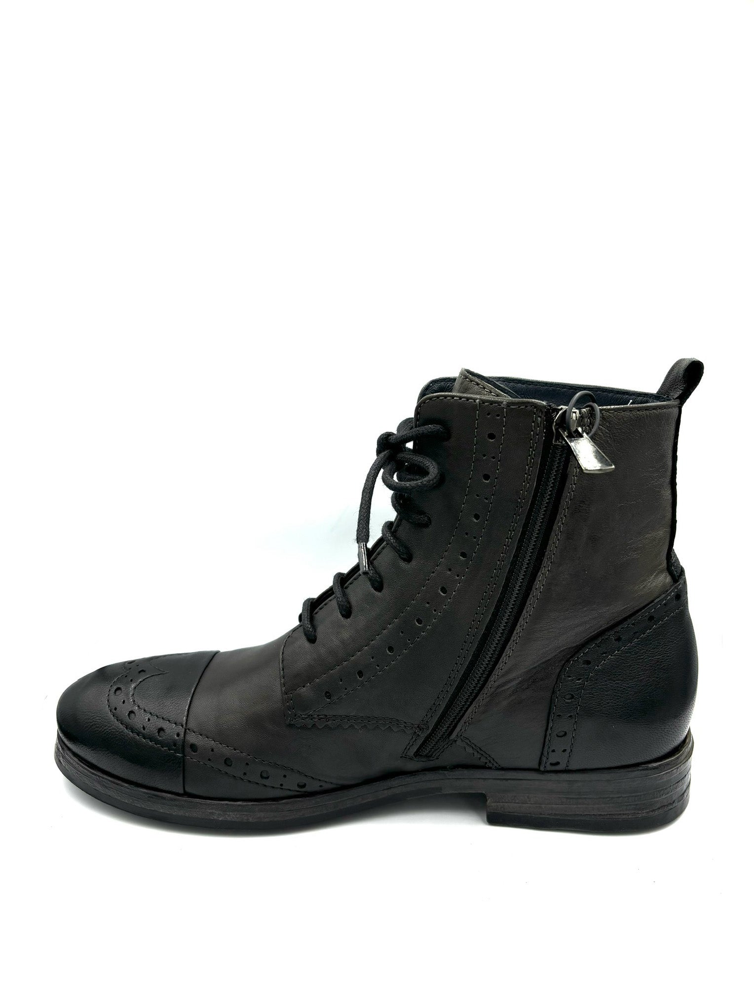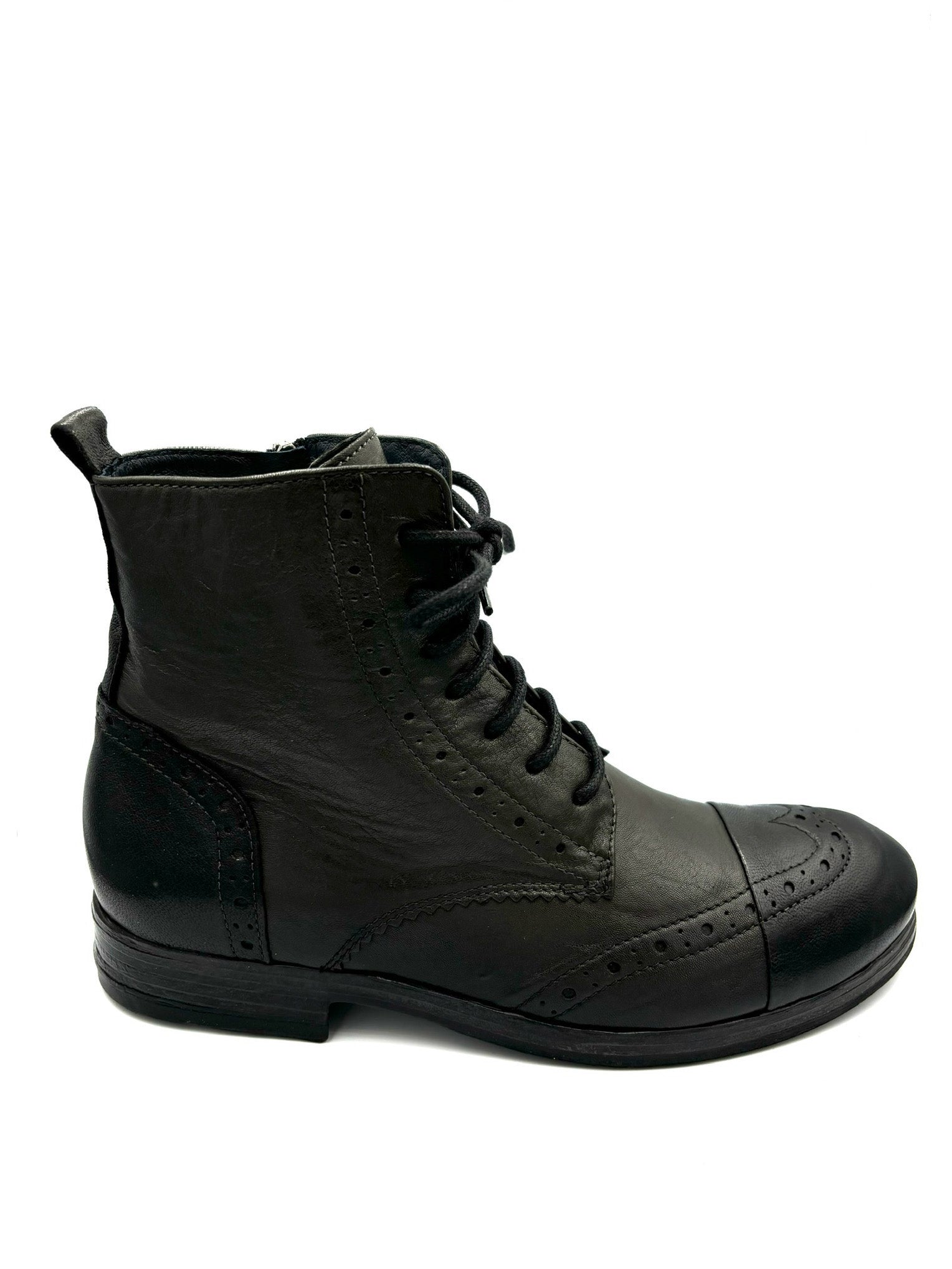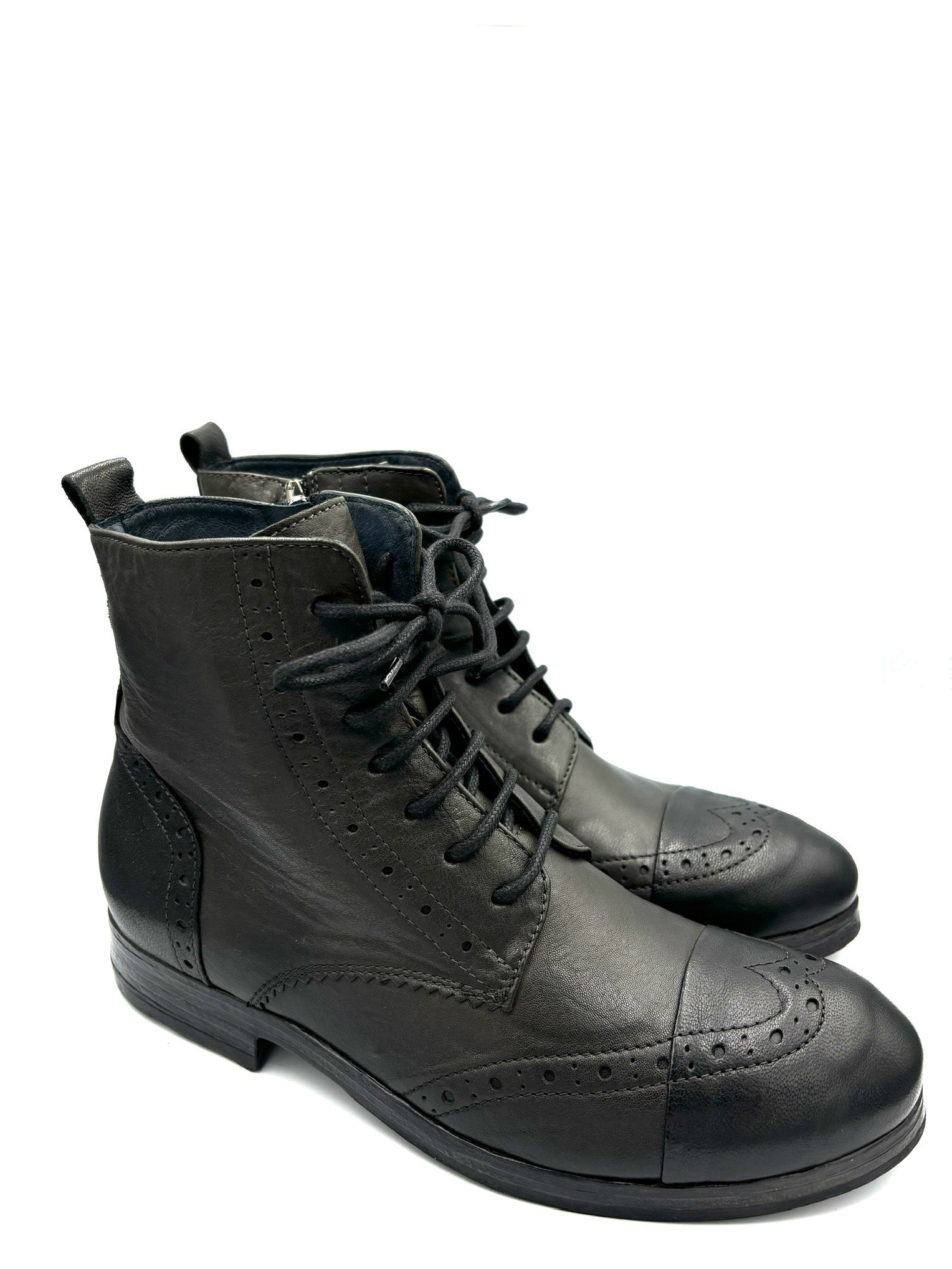 anfibio stringato con punta a coda di rondine. Comoda cerniera interna. Prodotto italiano completamente in pelle e suola in gomma 3cm.