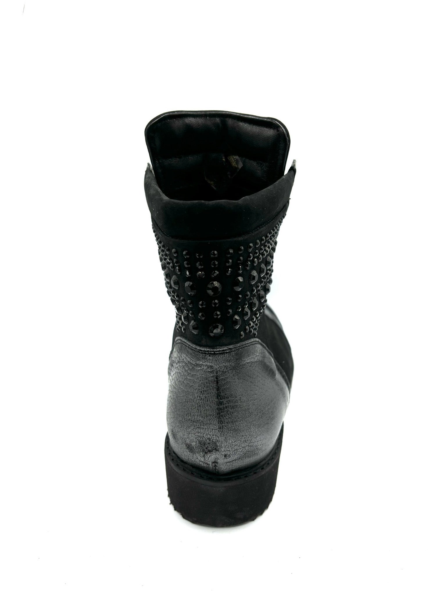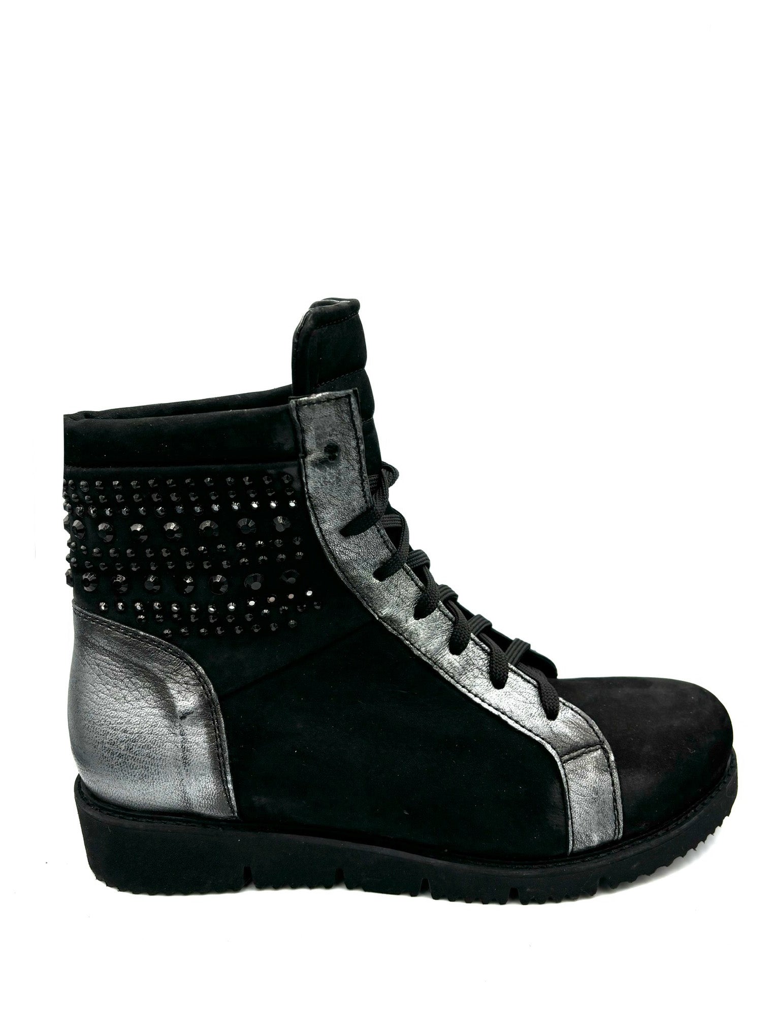 Anfibietto in pelle scamosciata con borchie e perle sulla parte alta della scarpa. Prodotto italiano con suola in gomma. Alzata suola 3,5cm