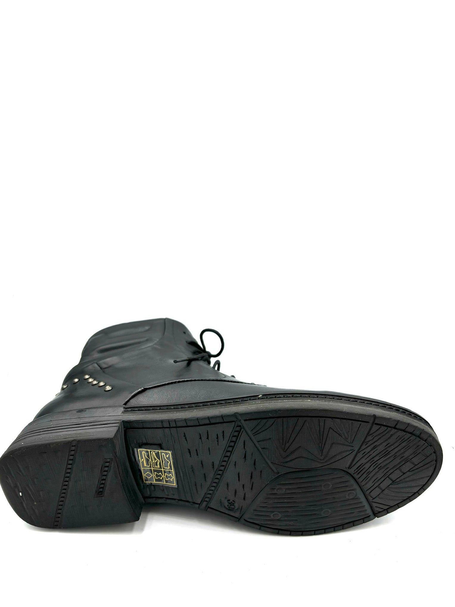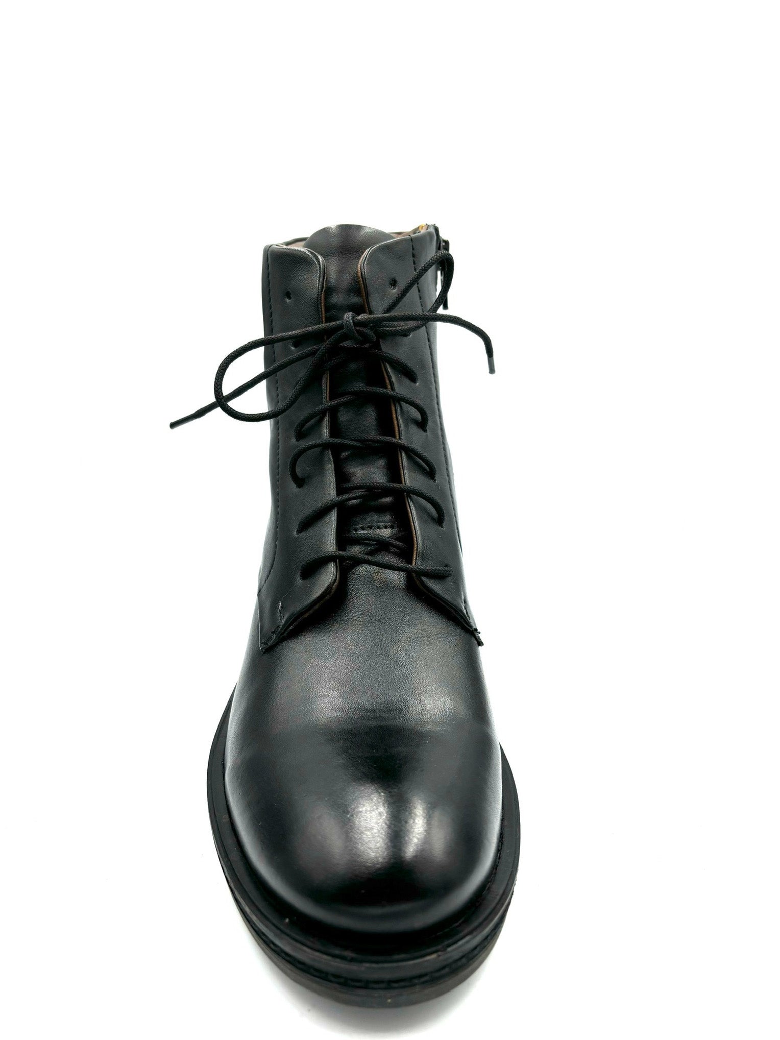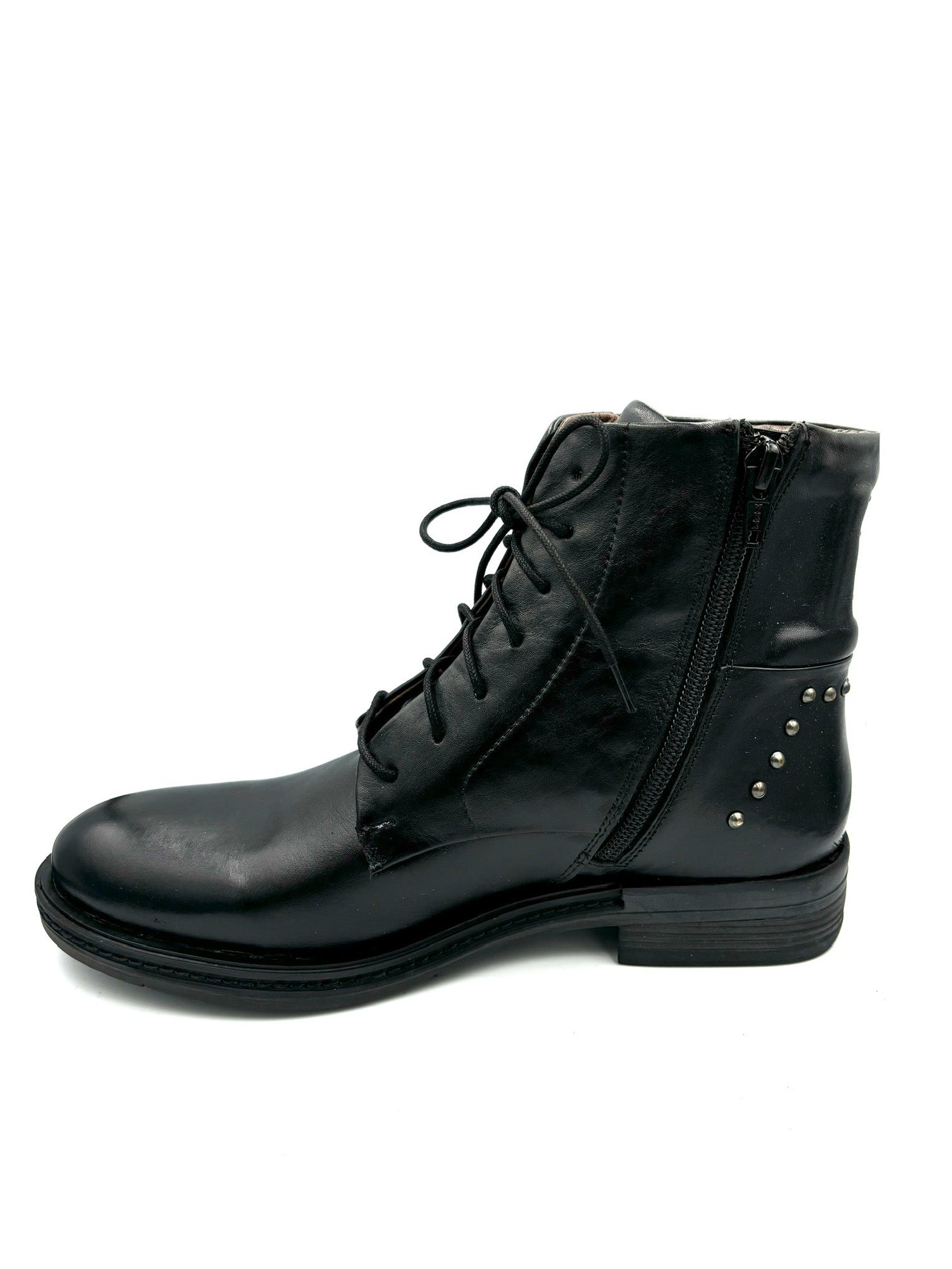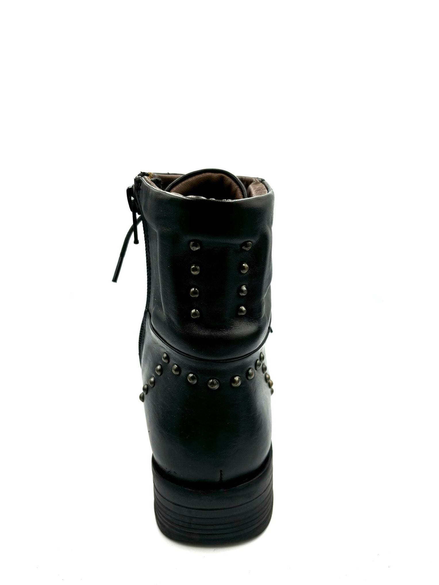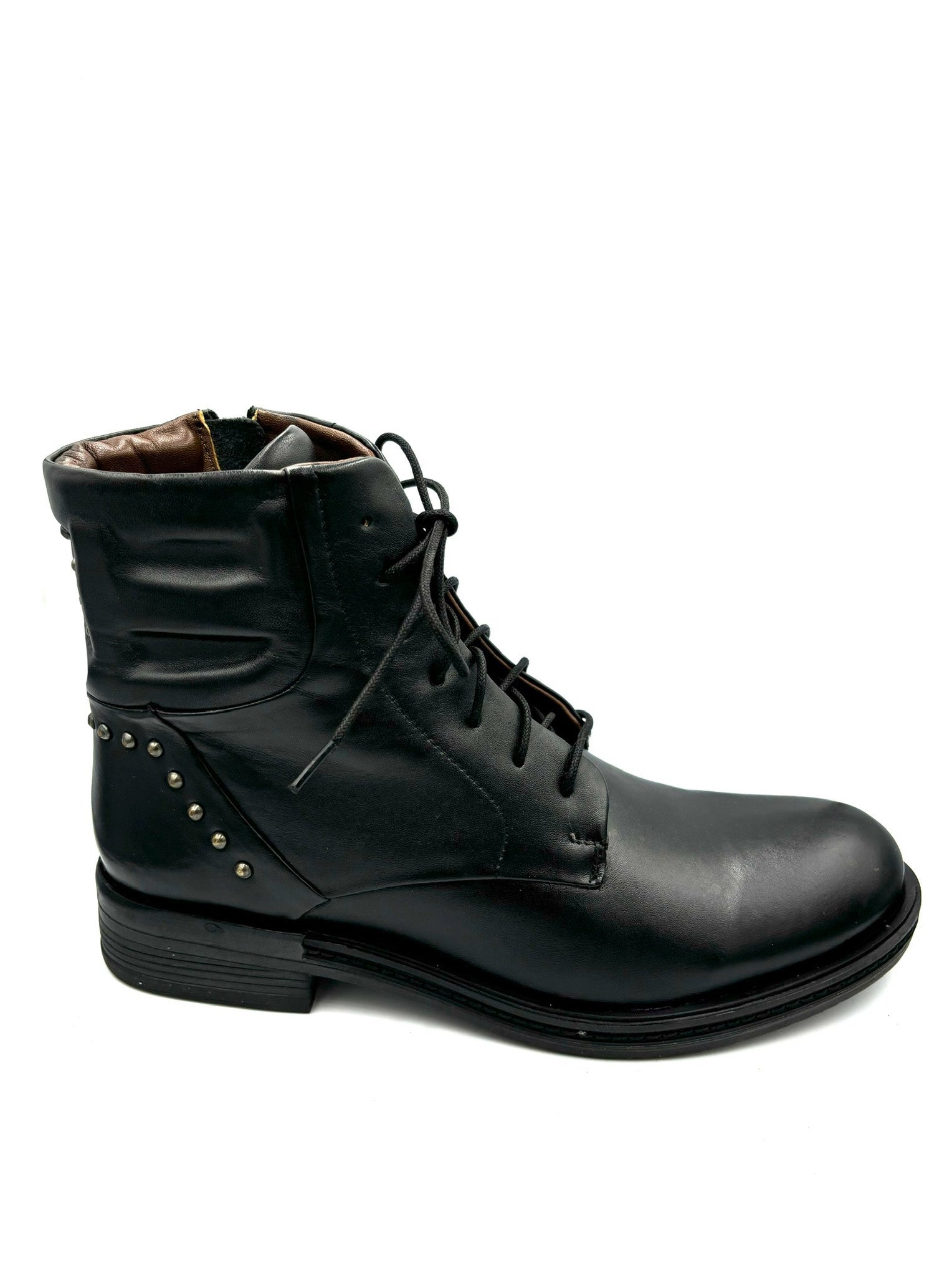 anfibietto stringato ma con cerniera interna. Impreziosito da dettagli color cuoio e borchiette posteriori. Prodotto italiano, completamente in pelle e suola in gomma 3,5cm.