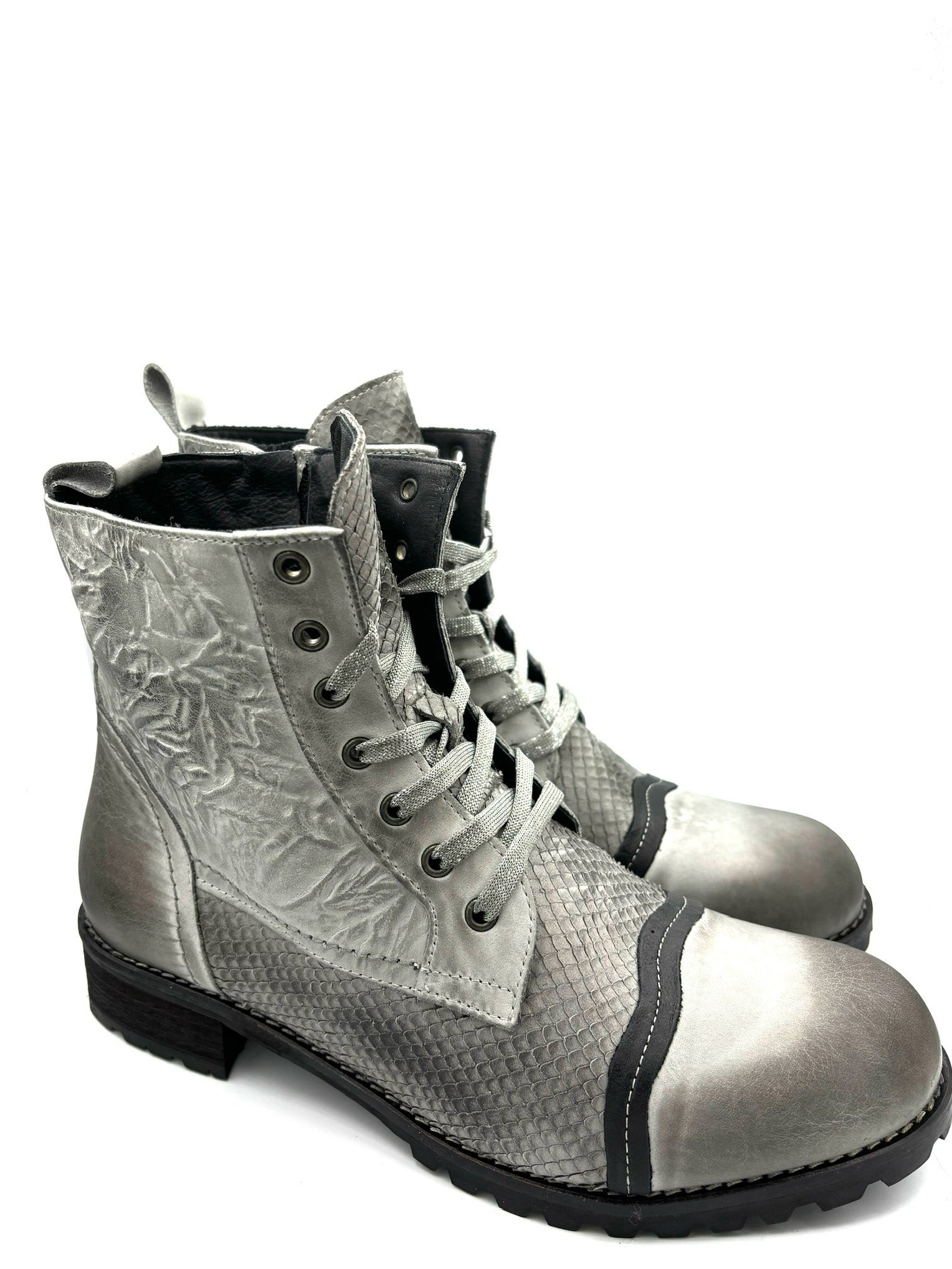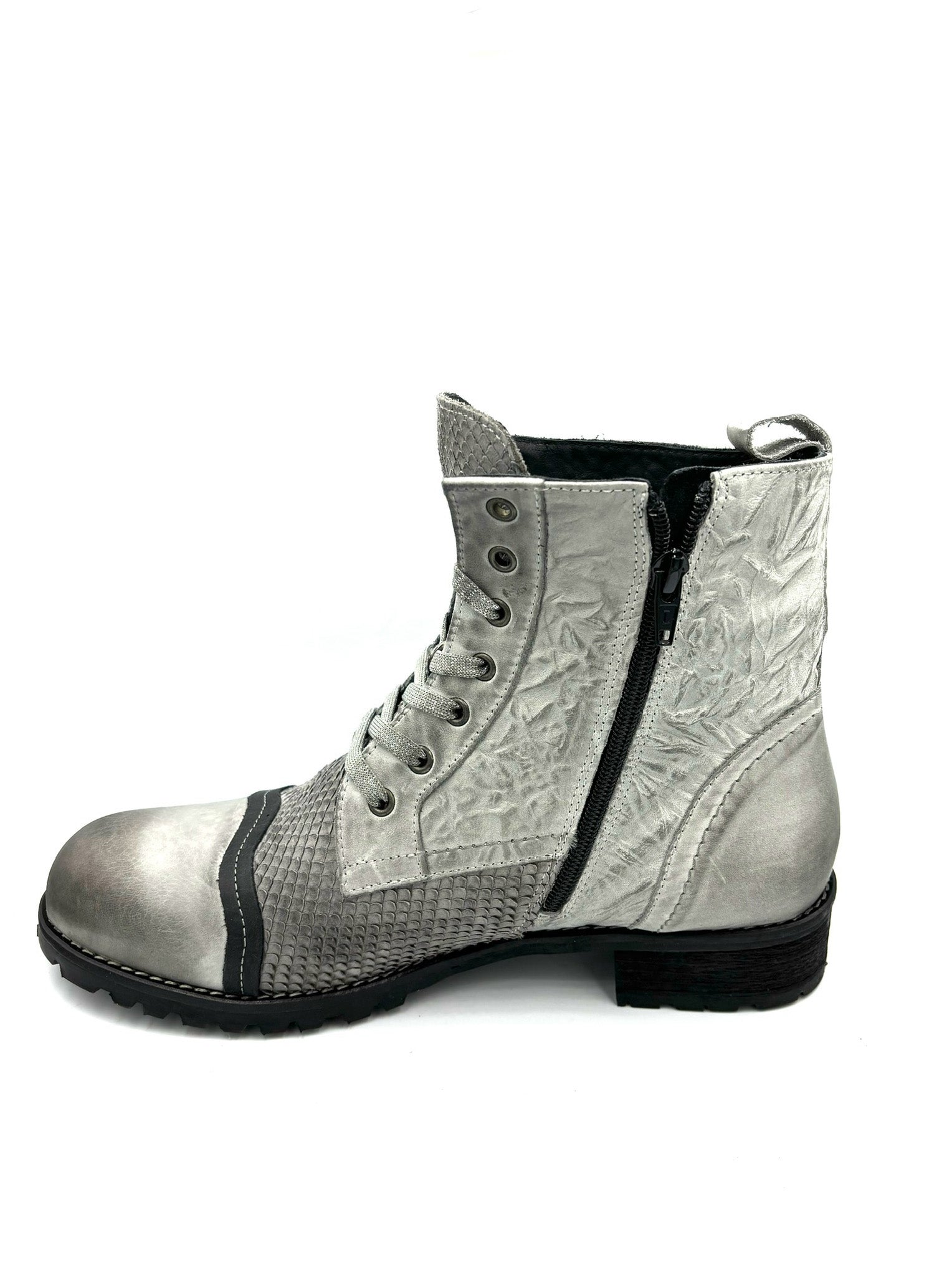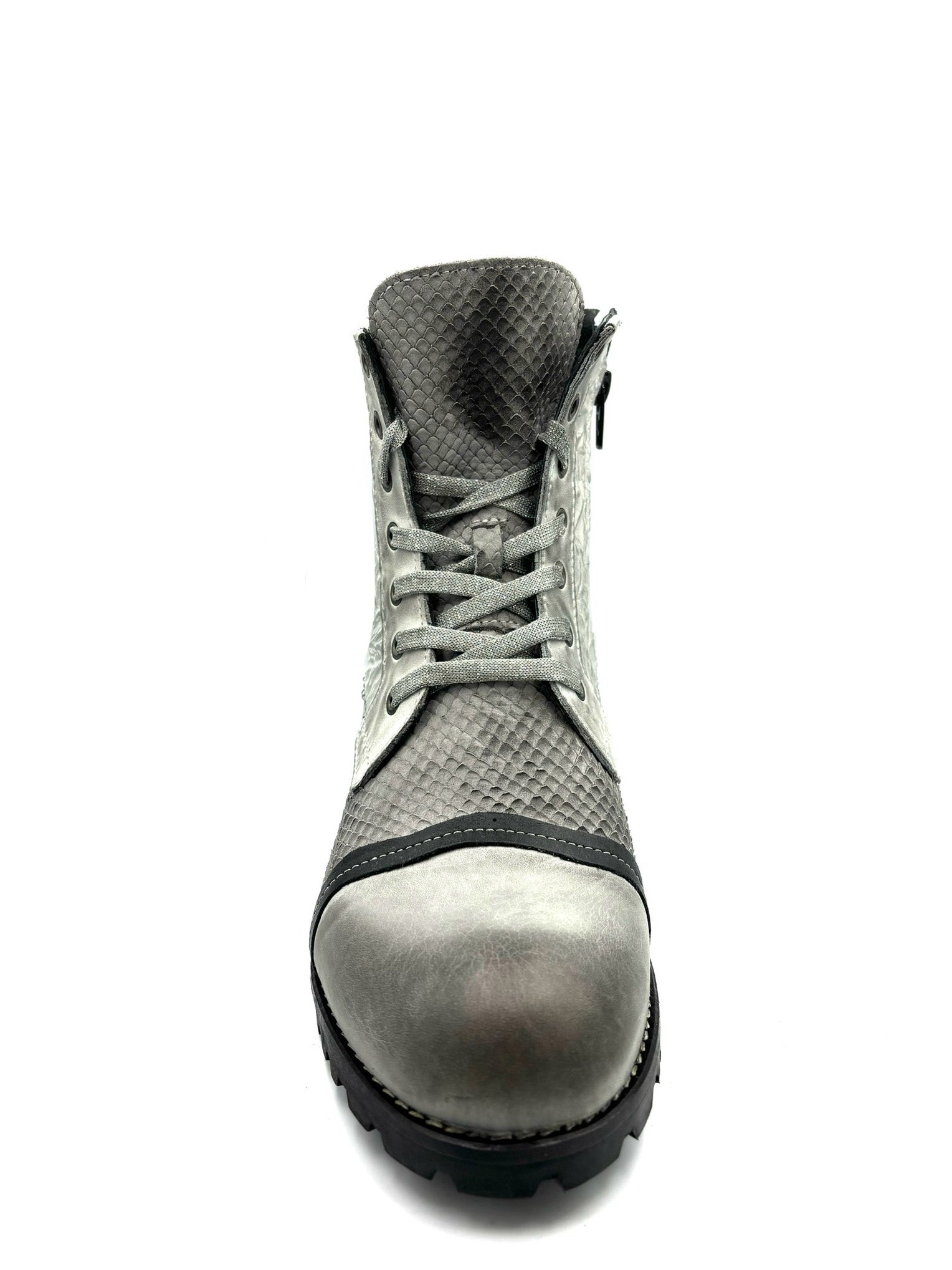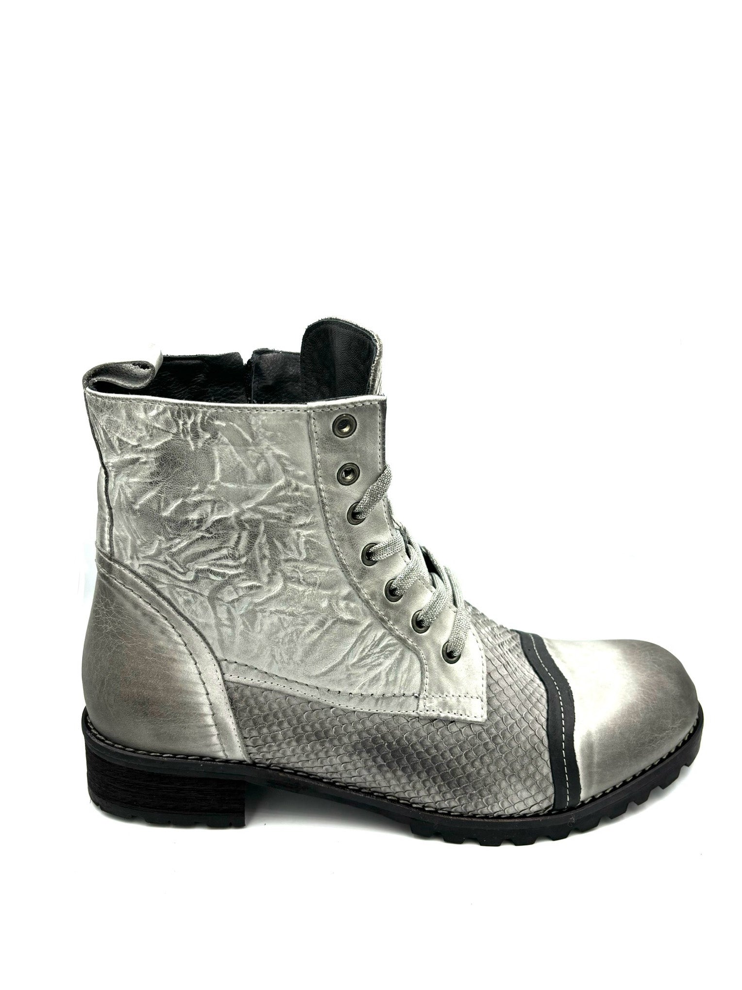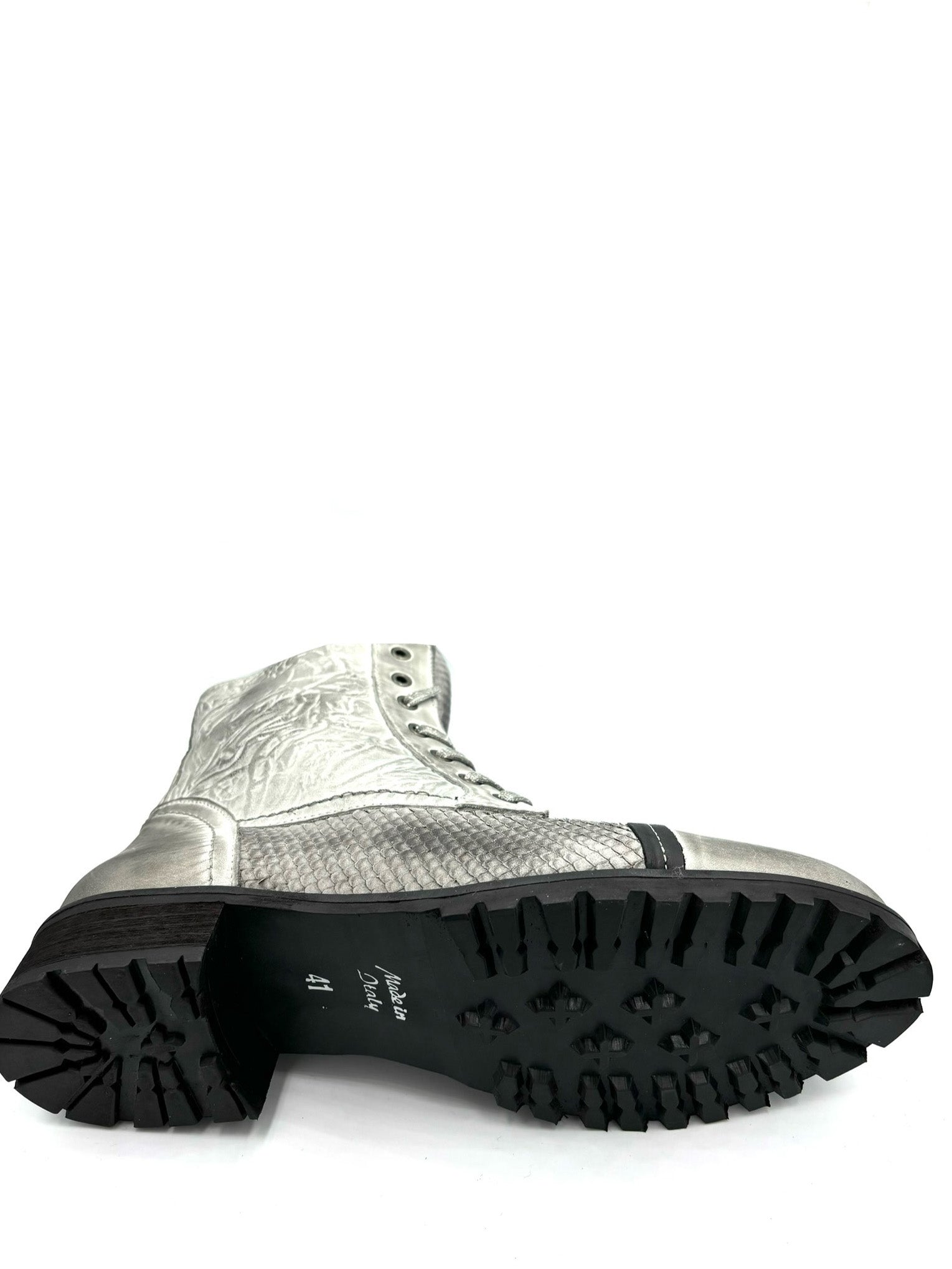 anfibio chiaro e animalier. Stringato ma con cerniera interna. Prodotto italiano, completamente in pelle e suola in gomma 3cm.