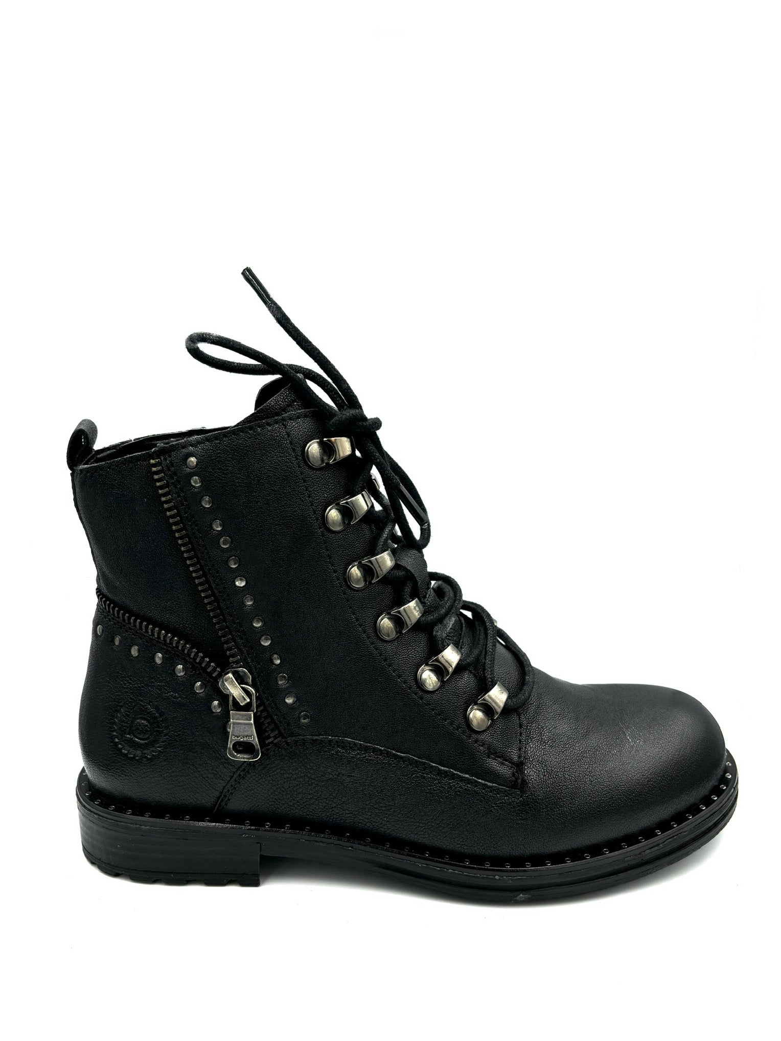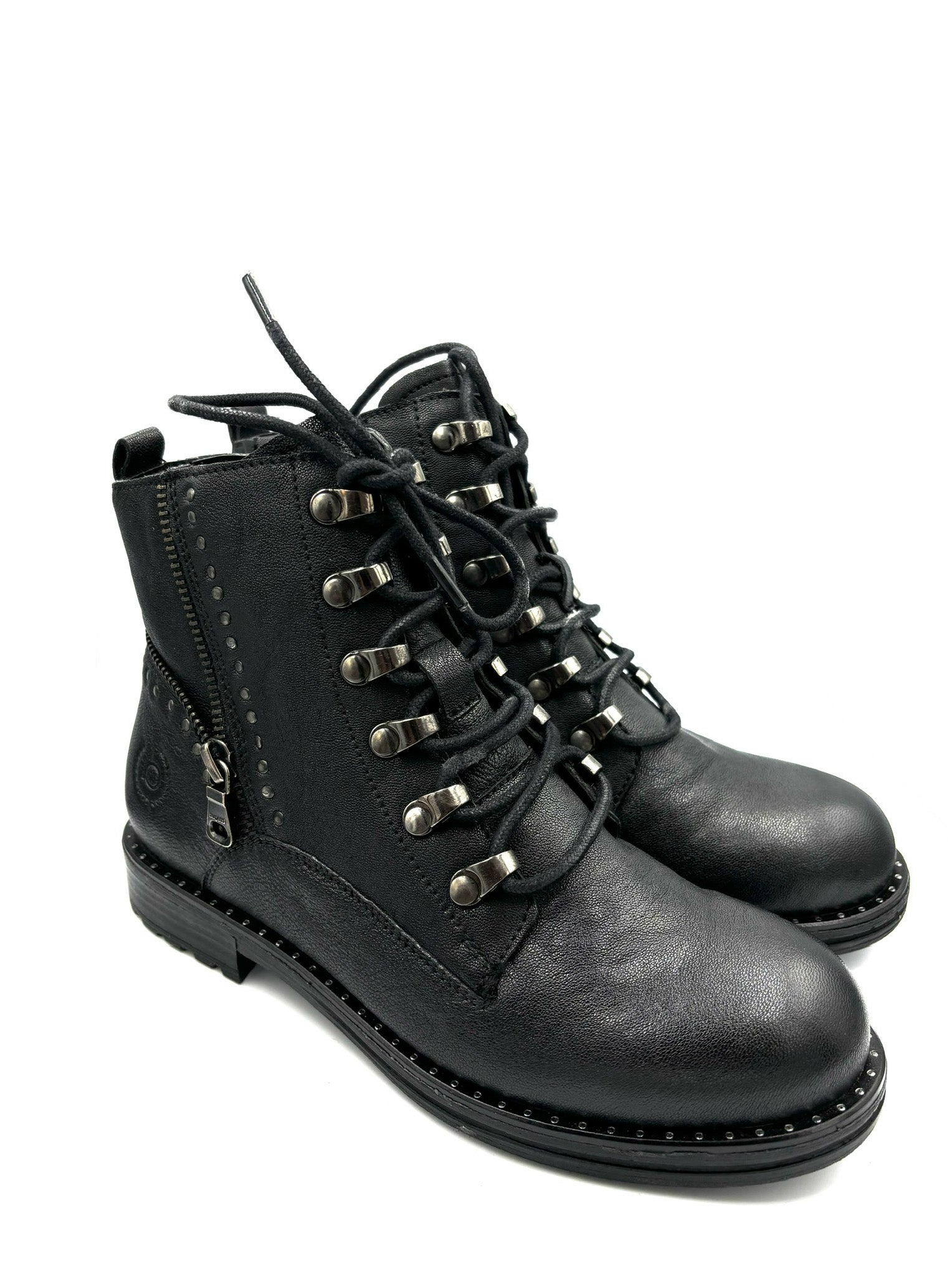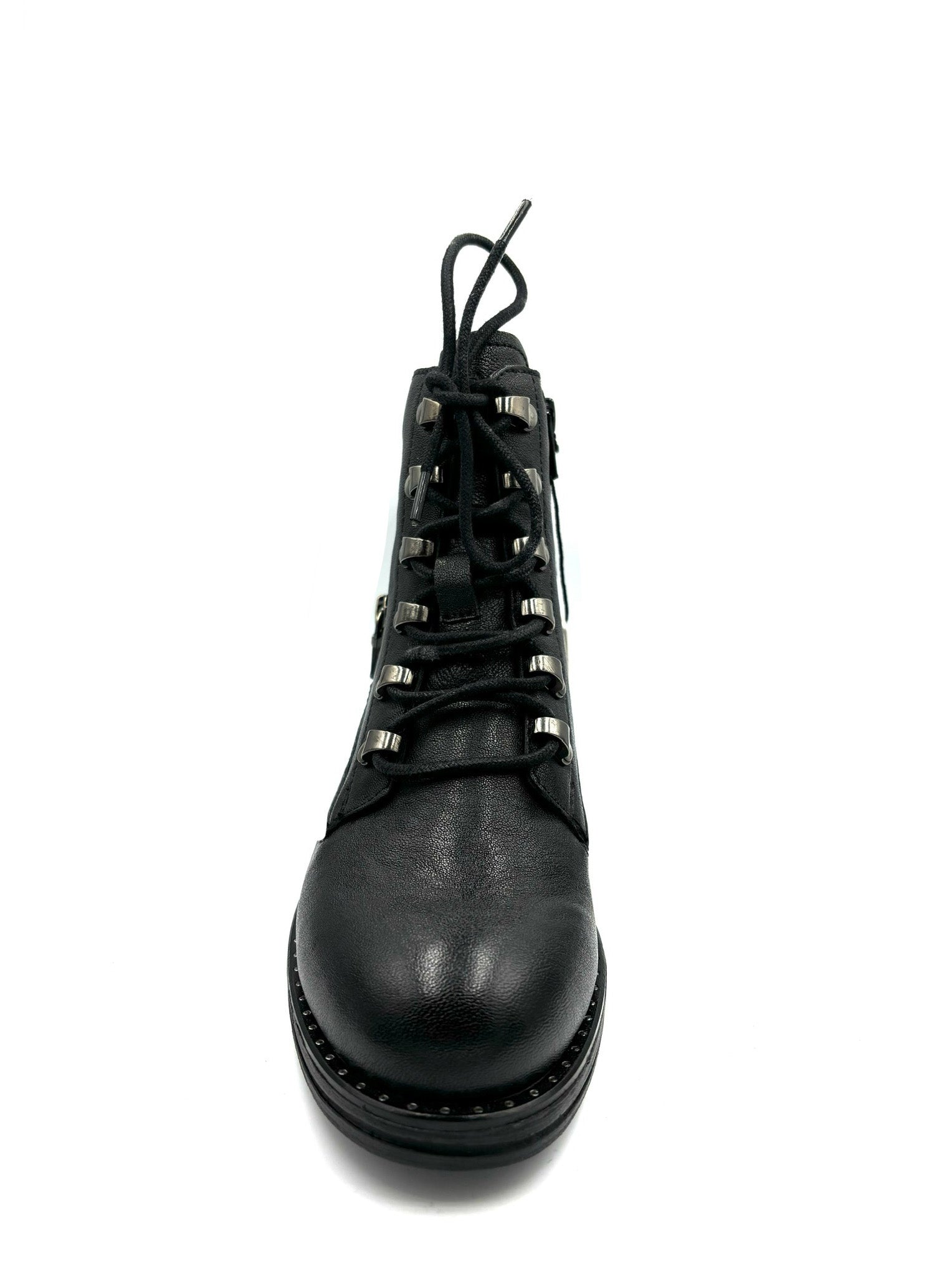 anfibio stringato ma con cerniera interna. Completamente in pelle e cerniera e borchie decorative posteriormente. Suola in gomma 2cm.