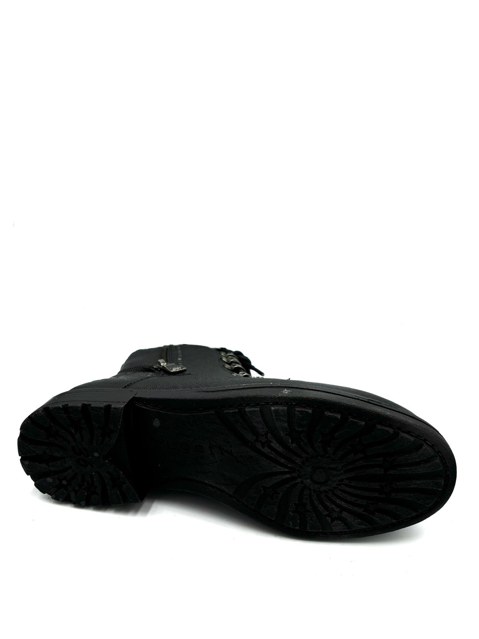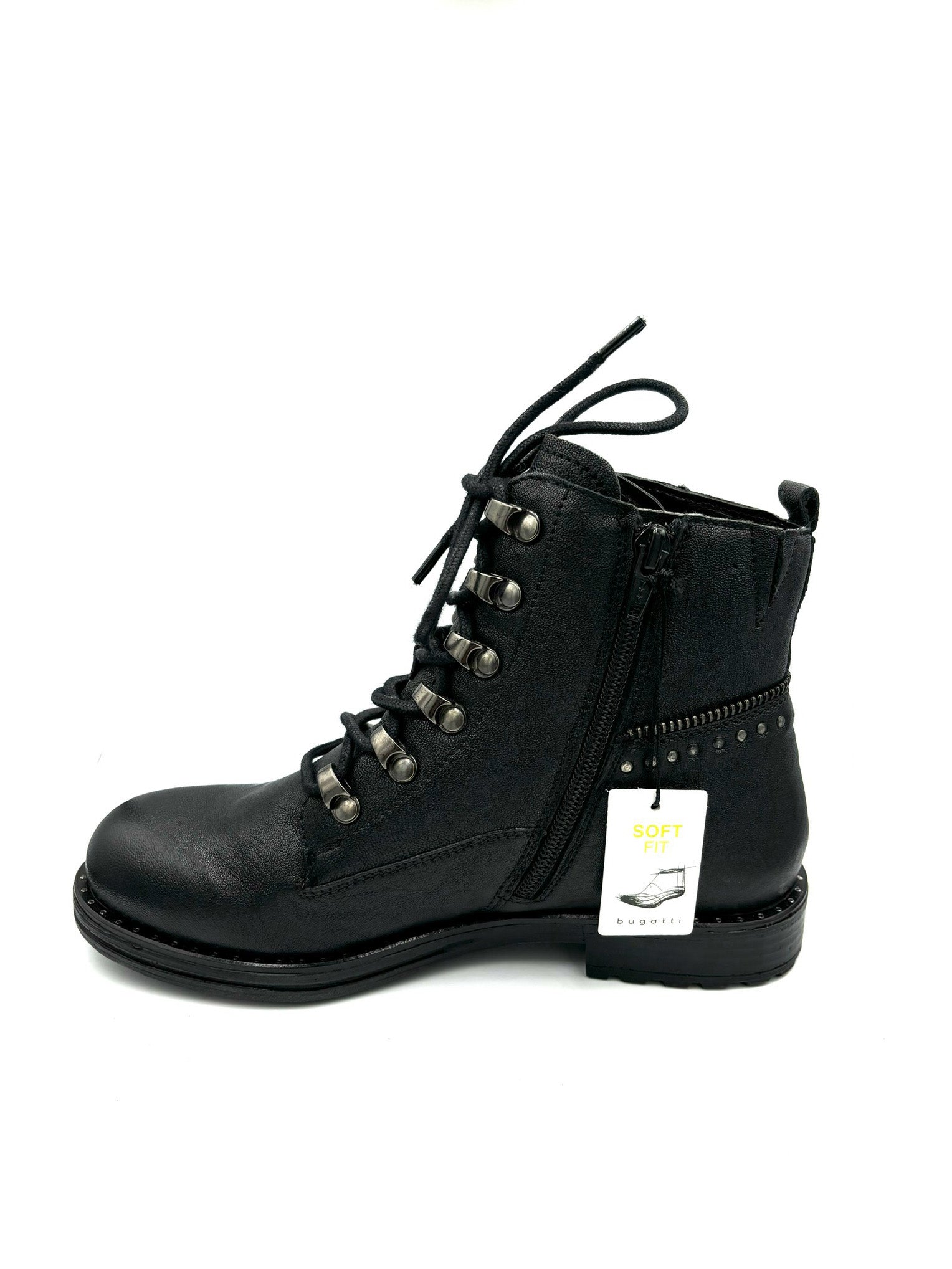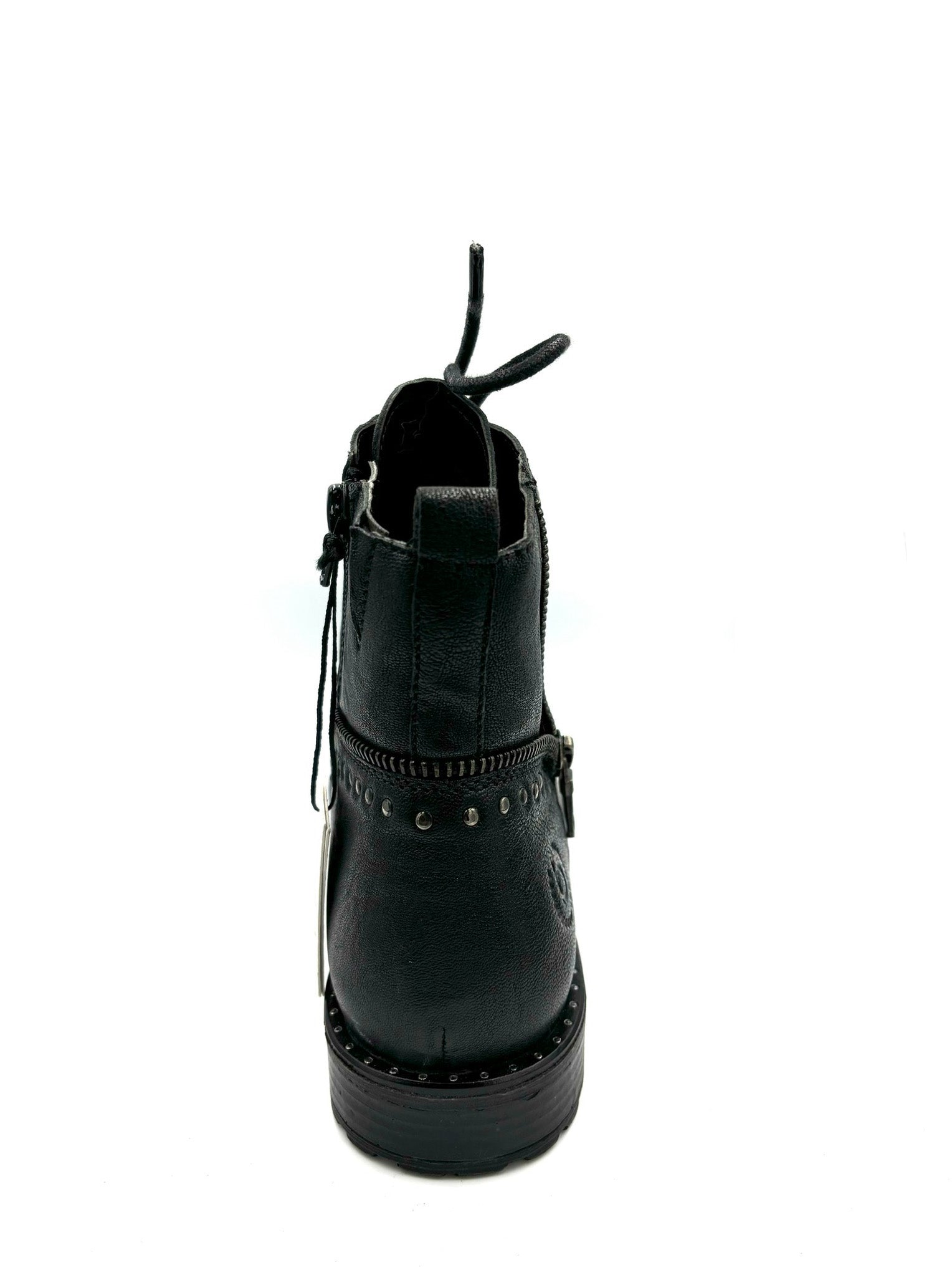 anfibio stringato ma con cerniera interna. Completamente in pelle e cerniera e borchie decorative posteriormente. Suola in gomma 2cm.