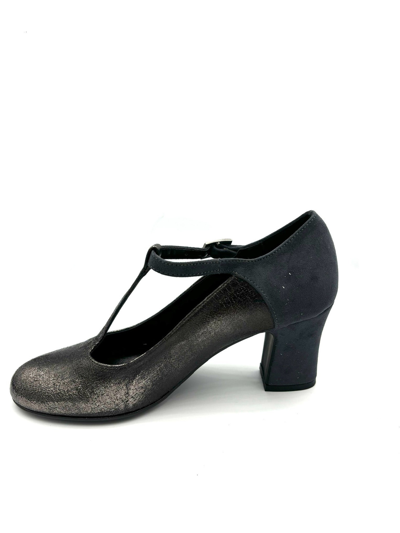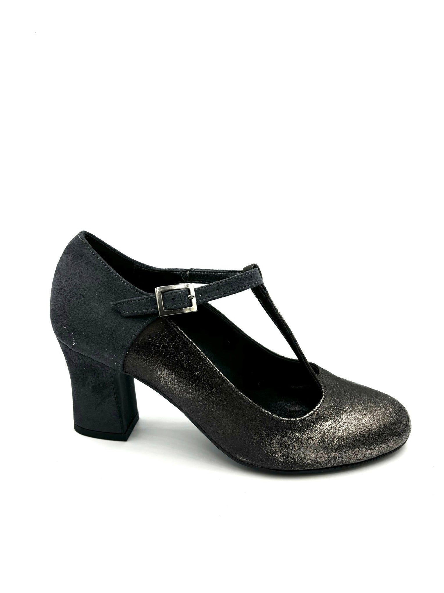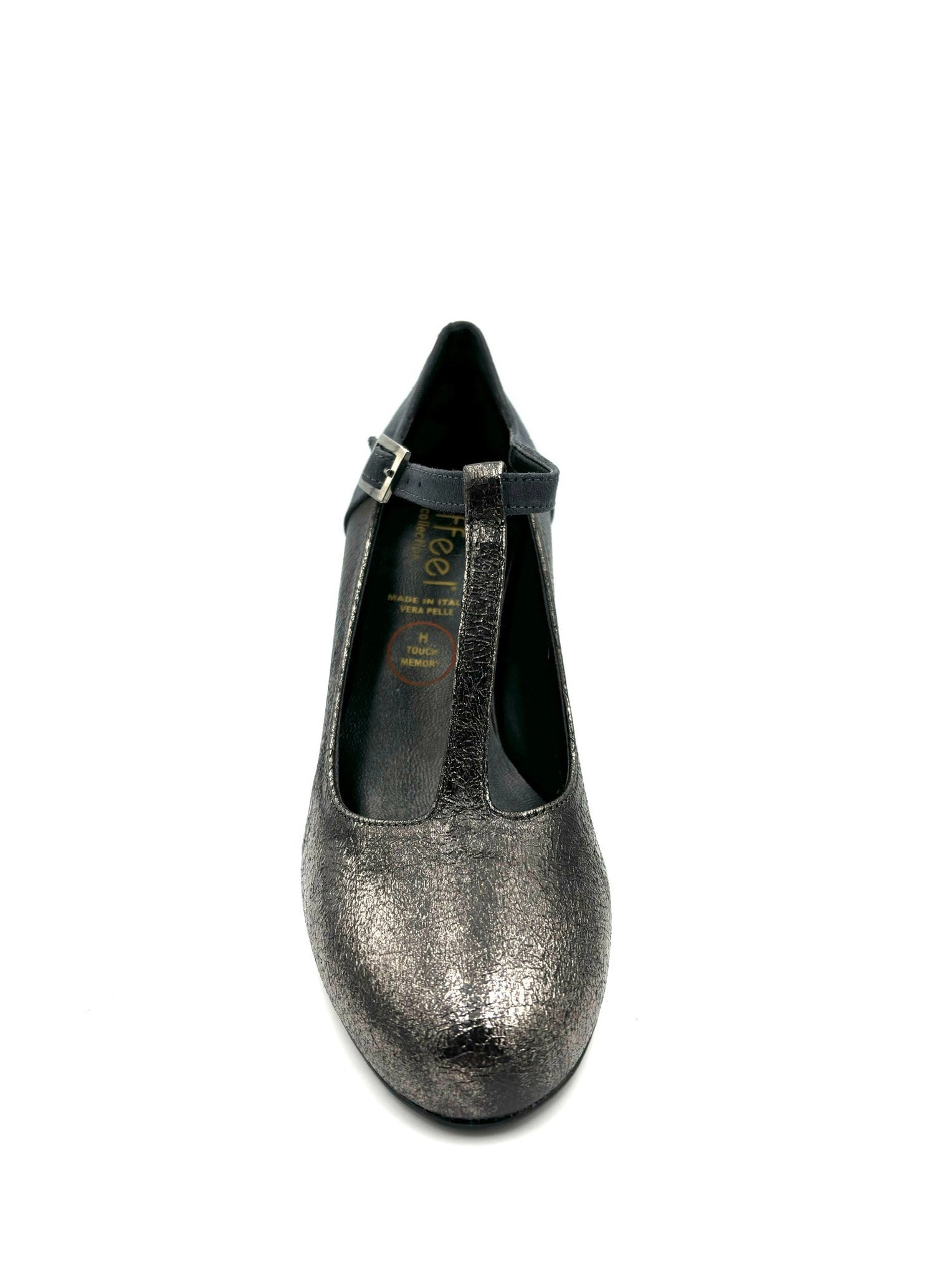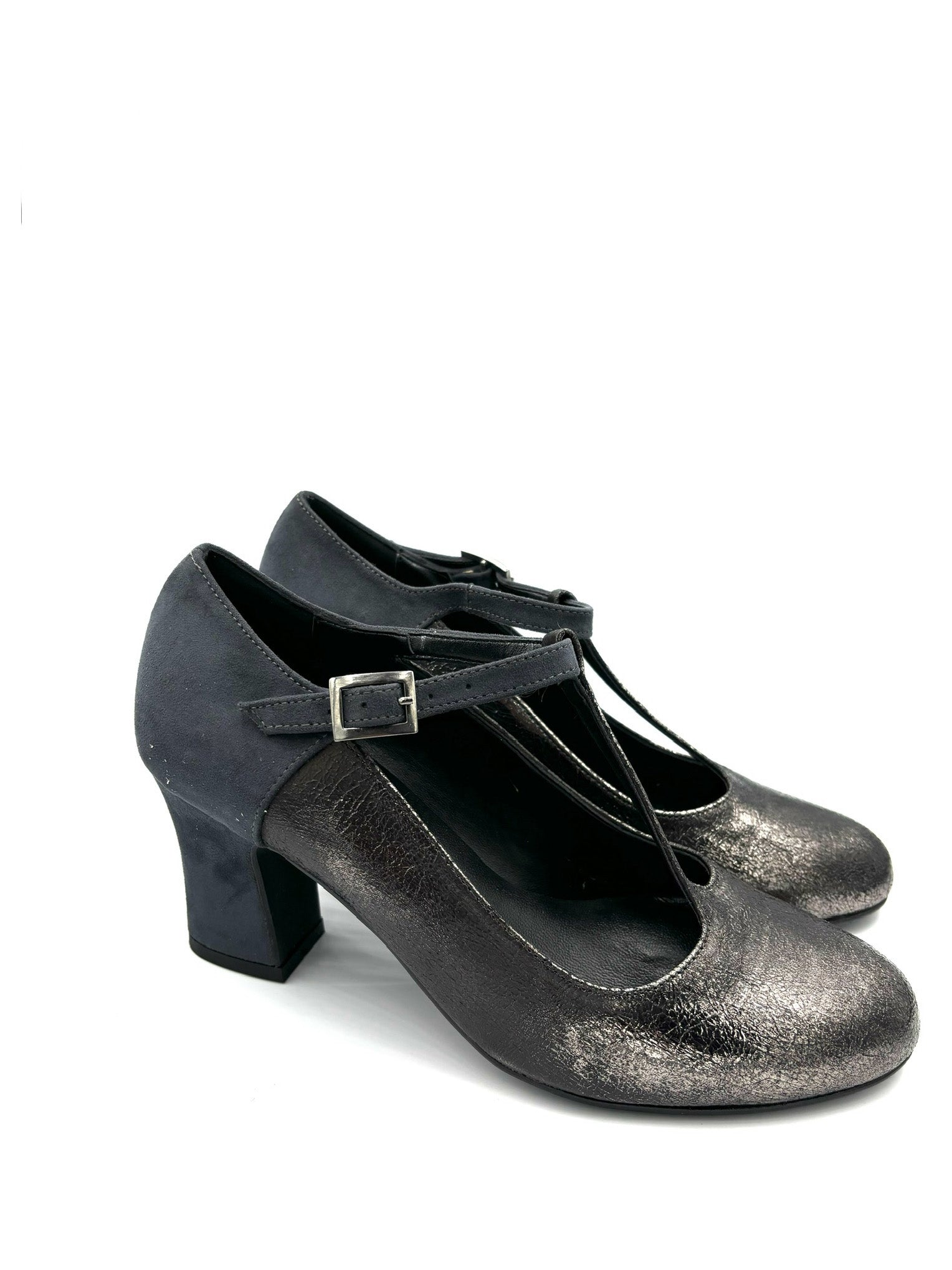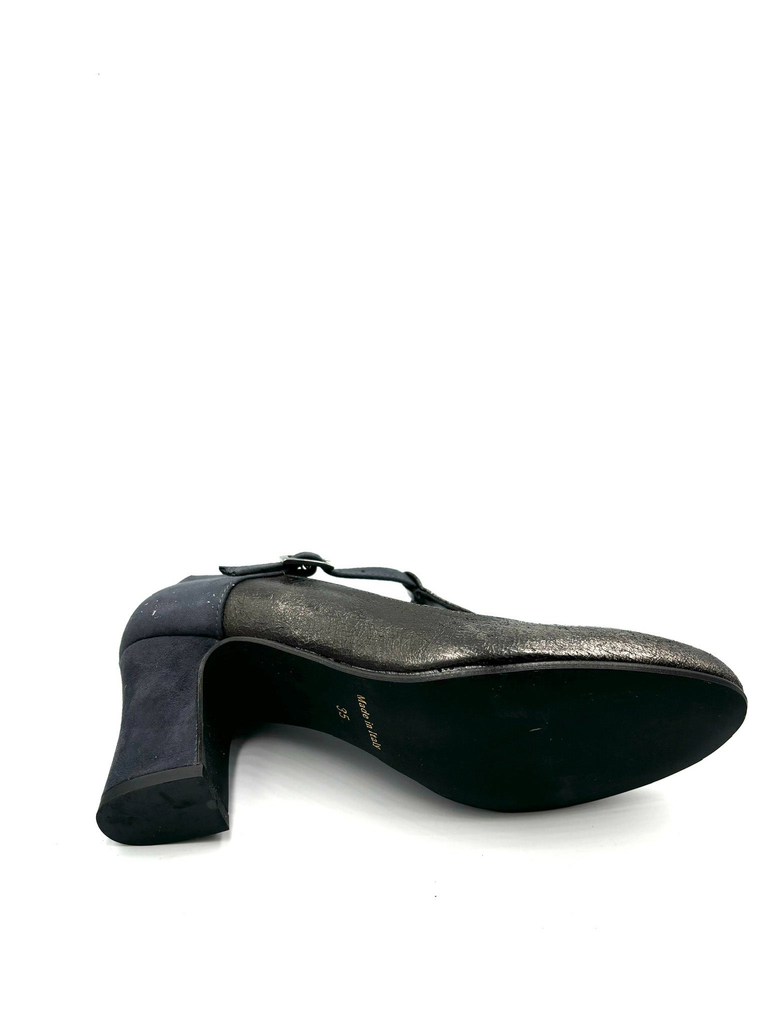 decoltè color piombo e blu sulla parte posteriore. Con cinturino da poter regolare con la sua fibbietta. Prodotto italiano con memory foam. Suola in gomma 7cm e in pelle misto ecopelle.