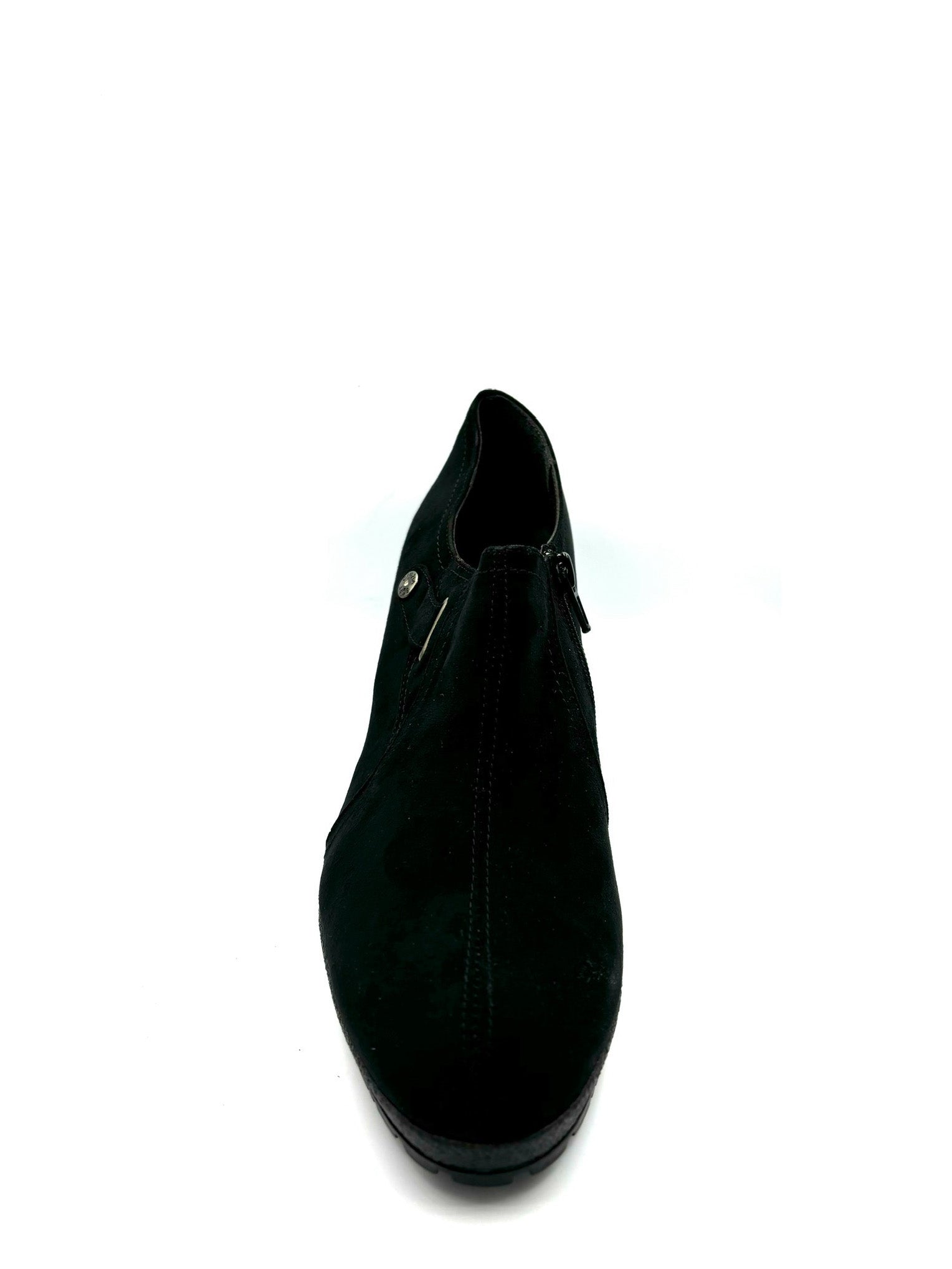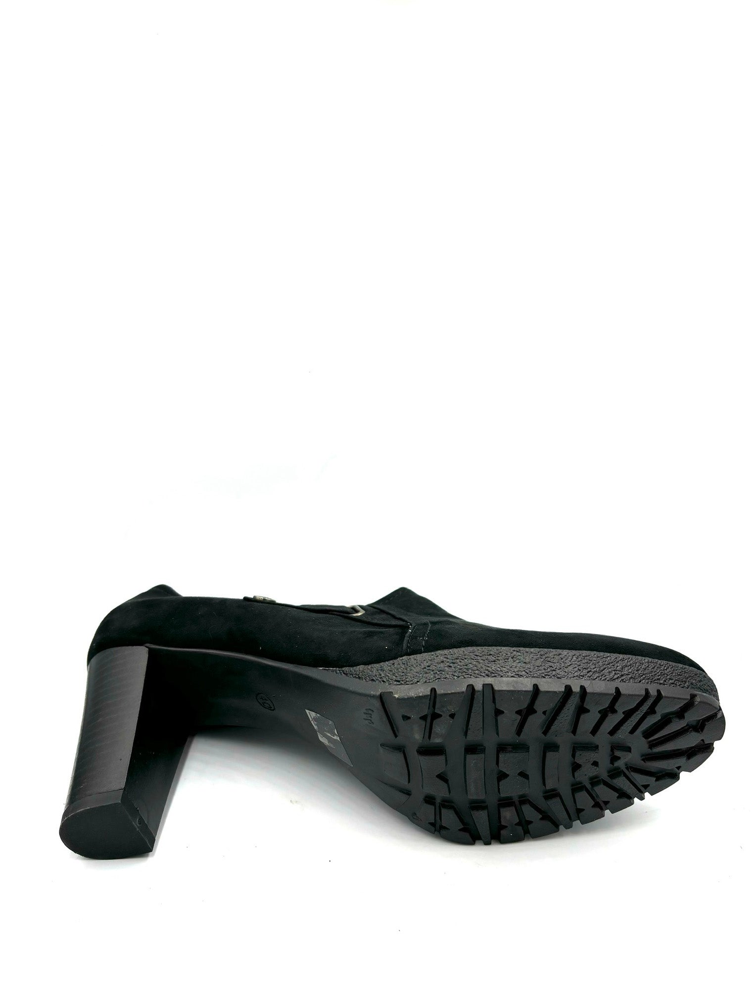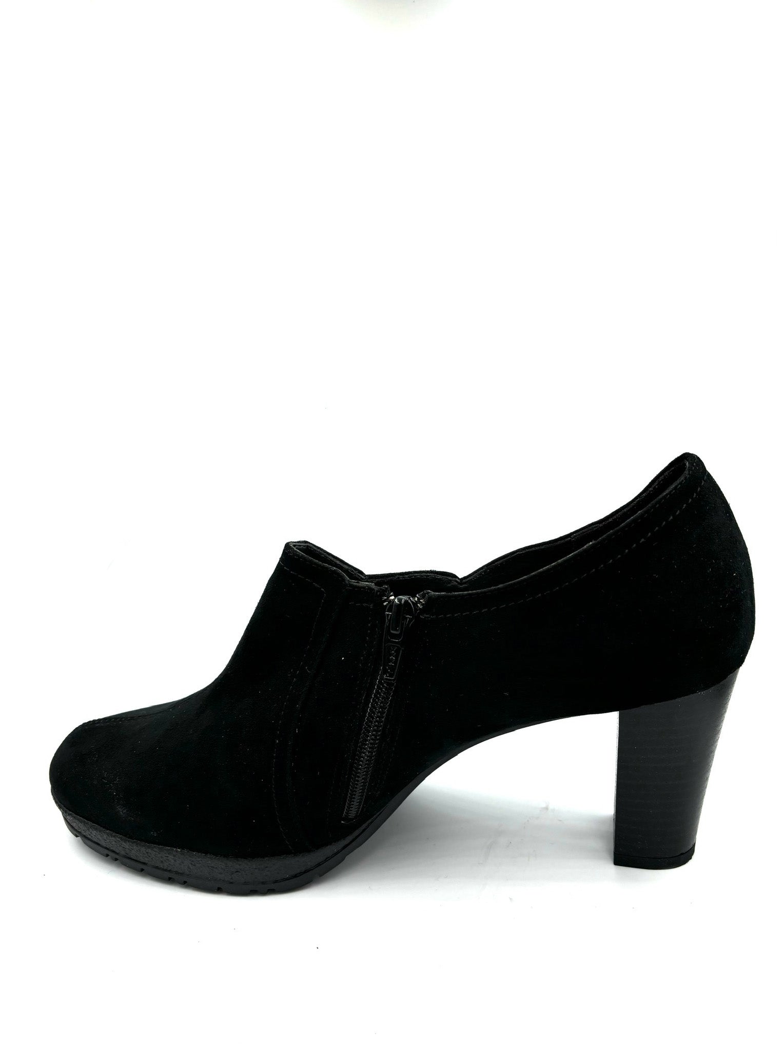 scarpa con tacco e cerniera interna per agevolare la calzata. Prodotto italiano, in pelle scamosciata nera e suola in gomma 9cm.