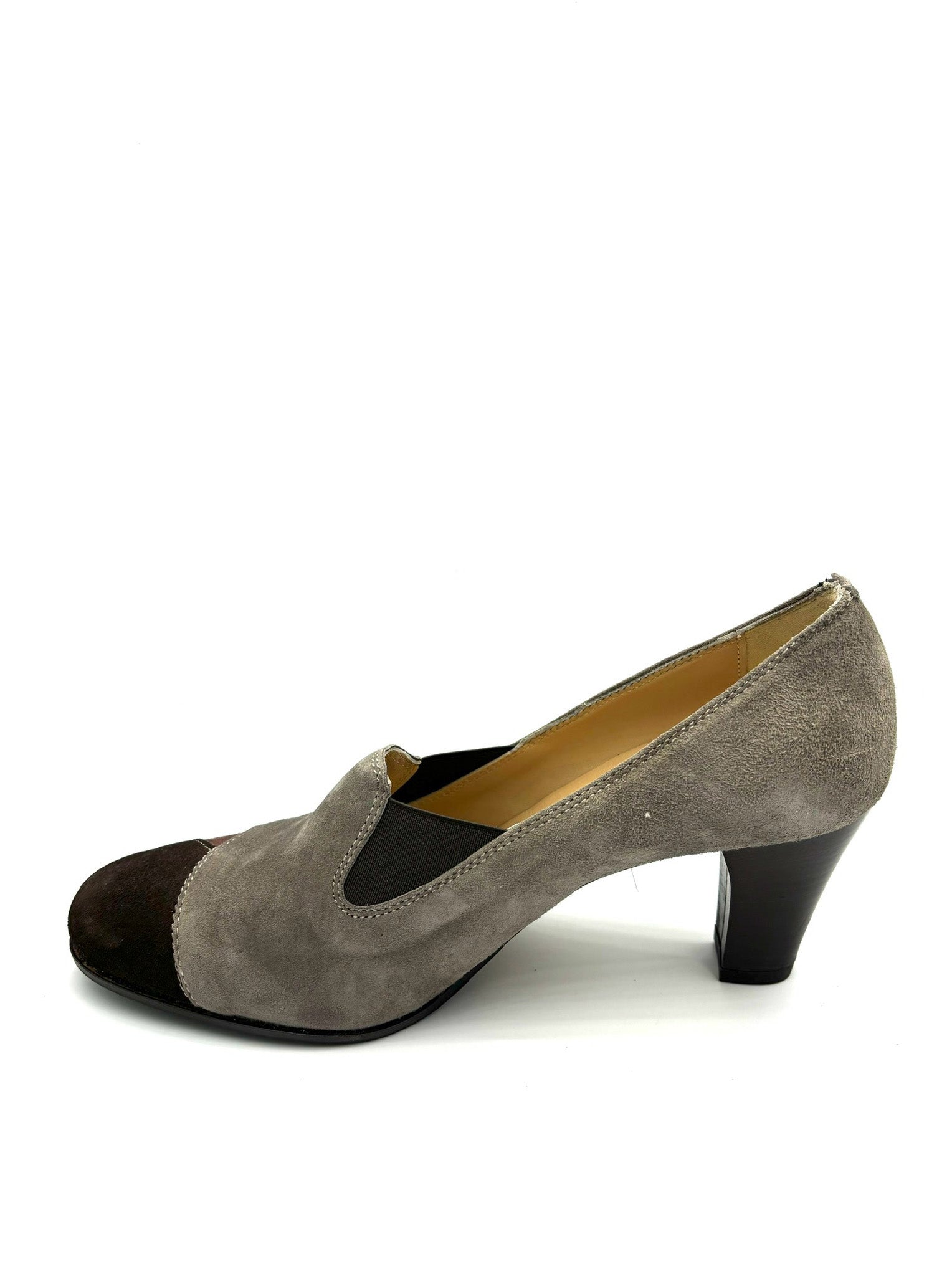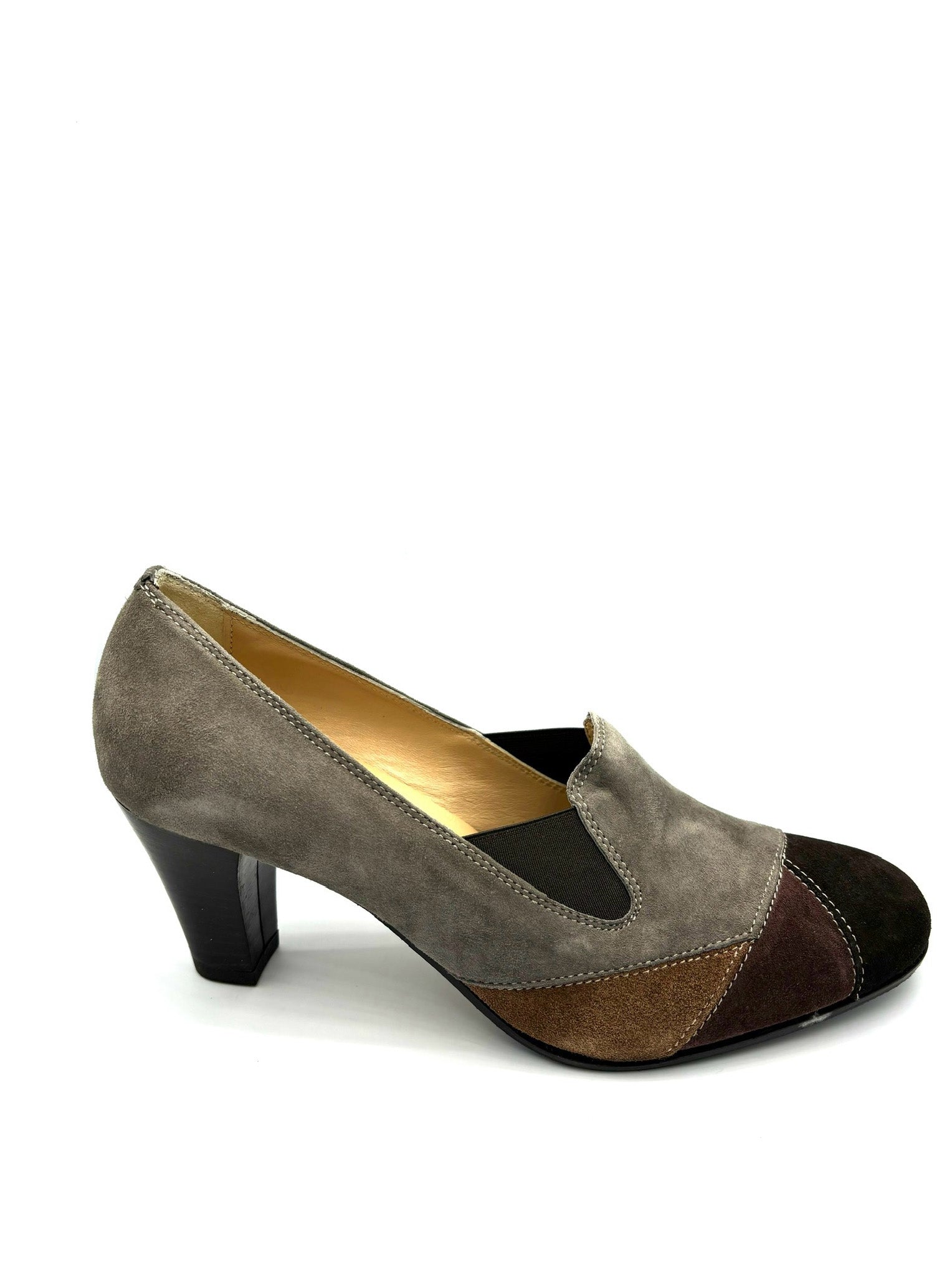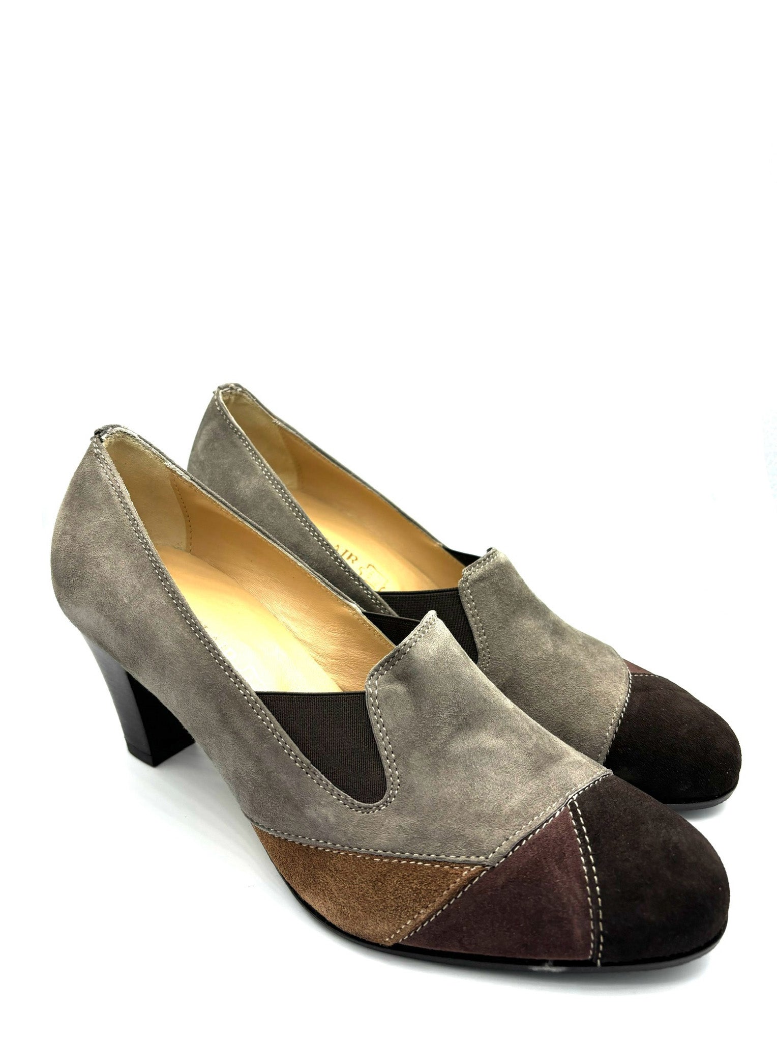 decoltè prodotto in Italia. Con elastico per agevolare la calzata. In pelle taupe e colorazioni sul marrone, suola in gomma e tacco 7cm