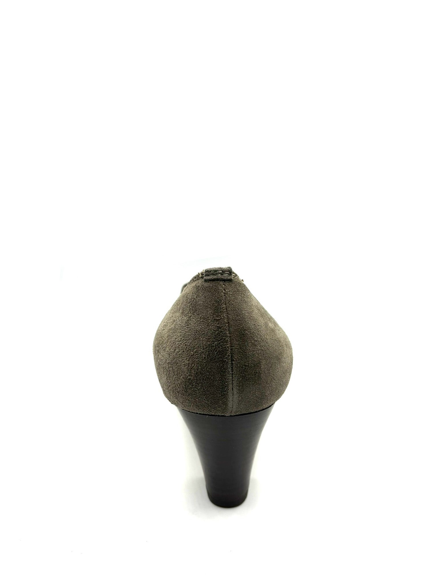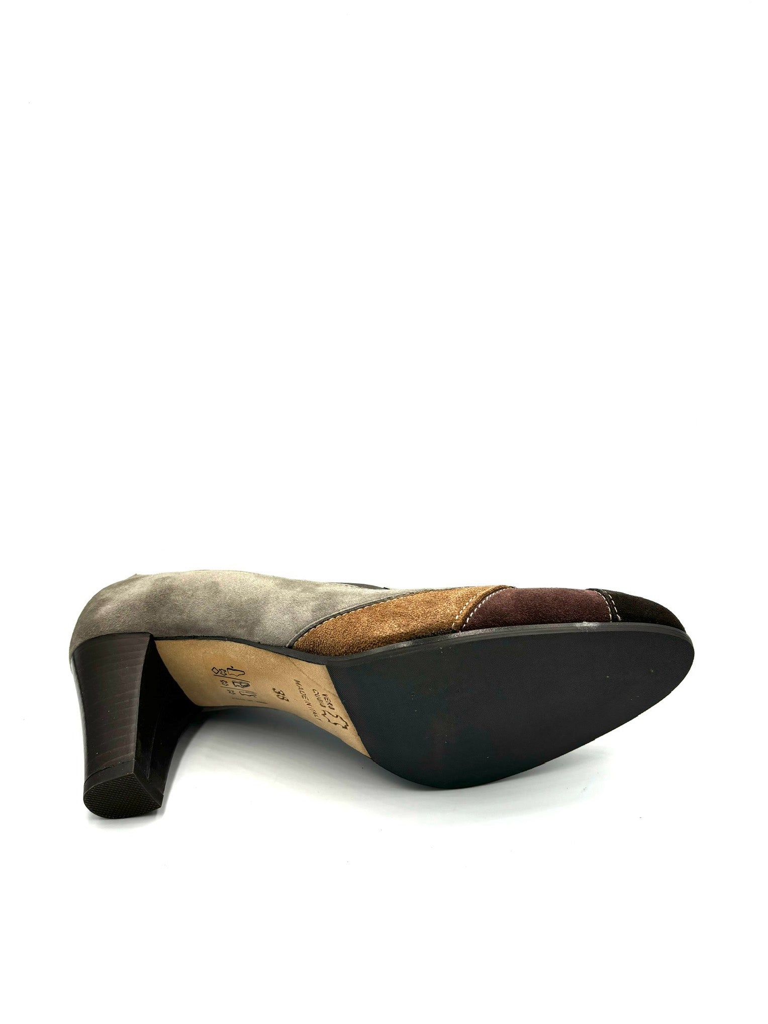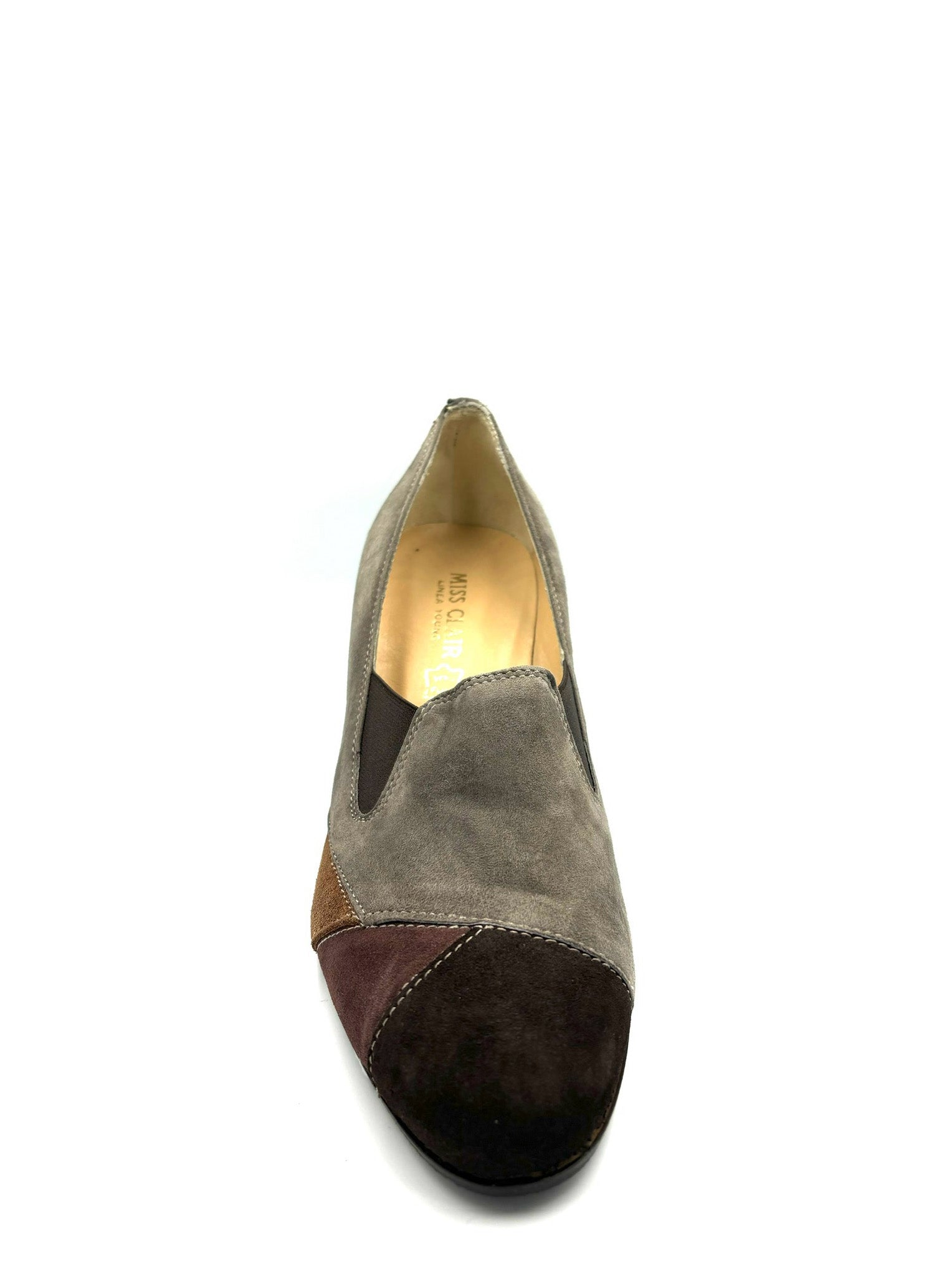 decoltè prodotto in Italia. Con elastico per agevolare la calzata. In pelle taupe e colorazioni sul marrone, suola in gomma e tacco 7cm