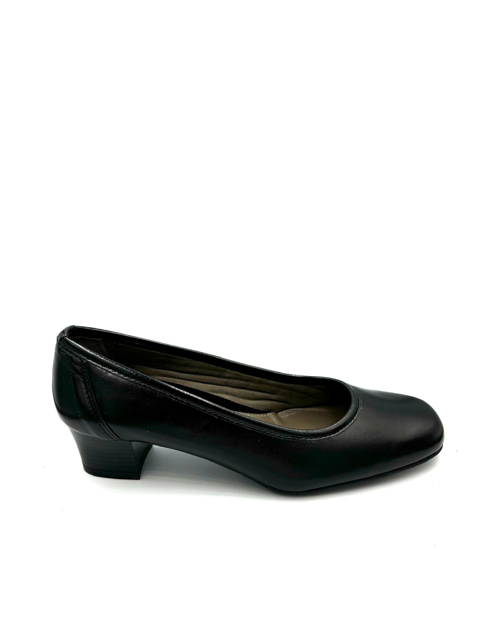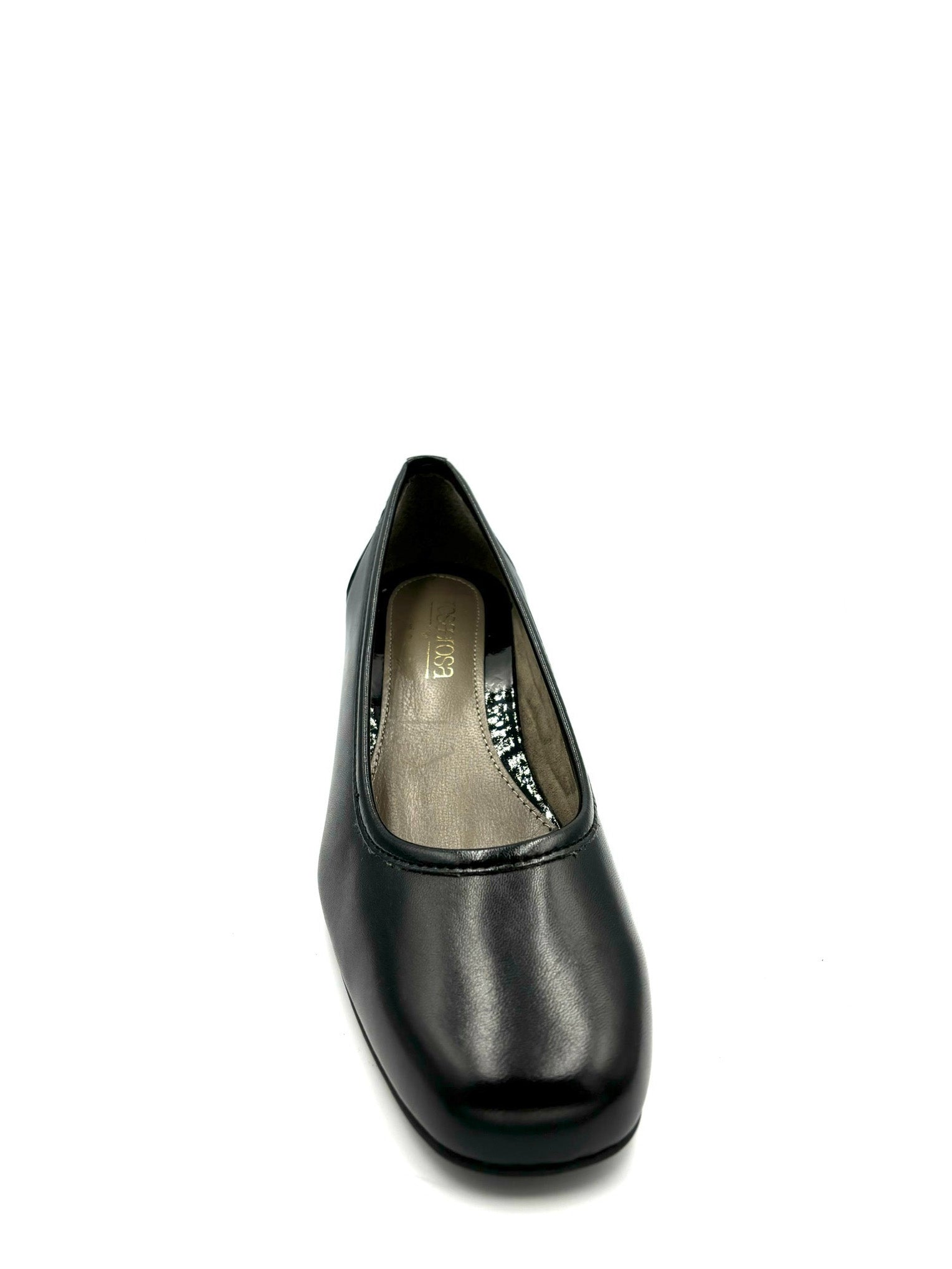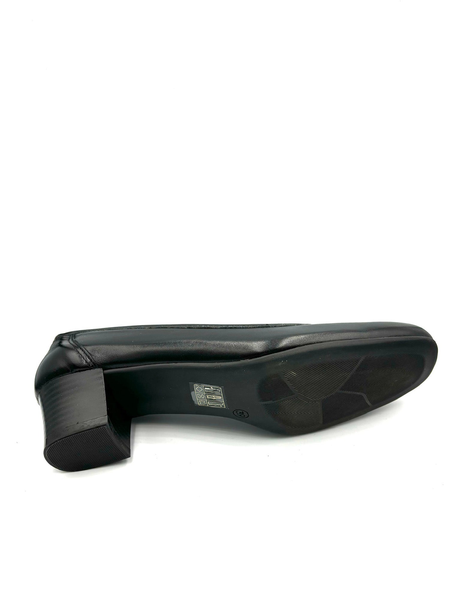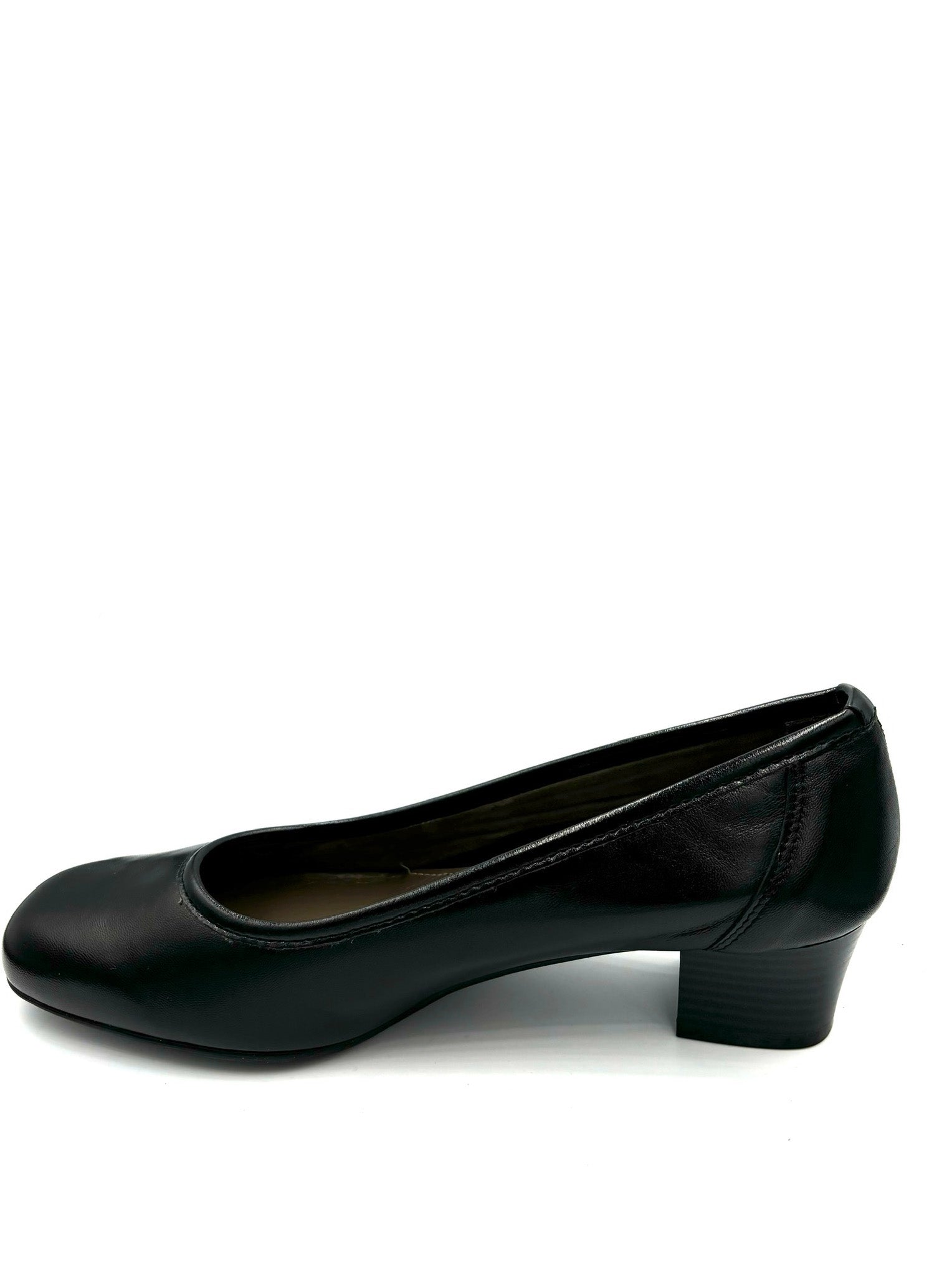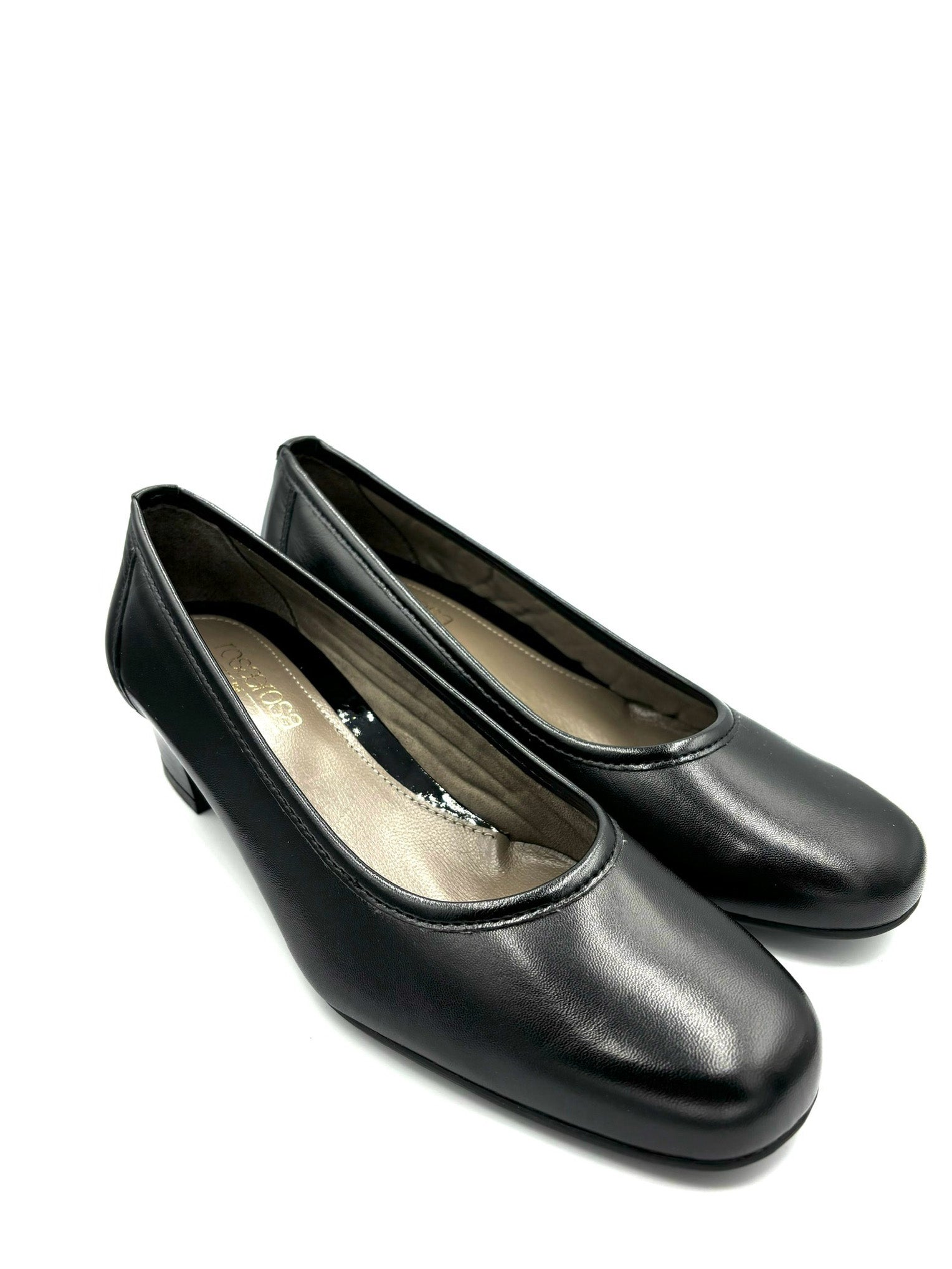Decoltè nero semplice totalmente in pelle e foderato all'interno per rendere la scarpa più confortevole. Suola in gomma anti rumore 5cm. Prodotto italiano!
