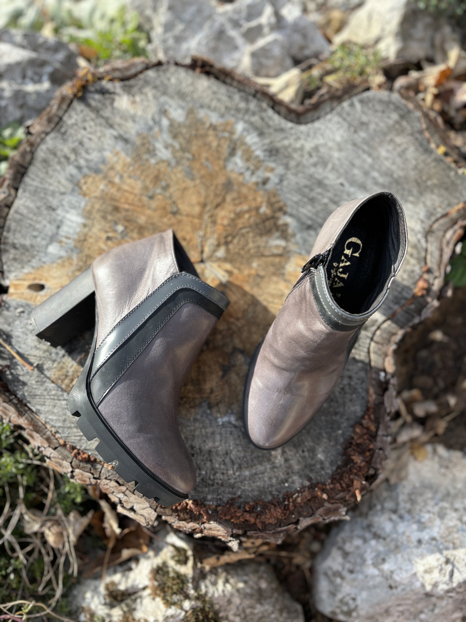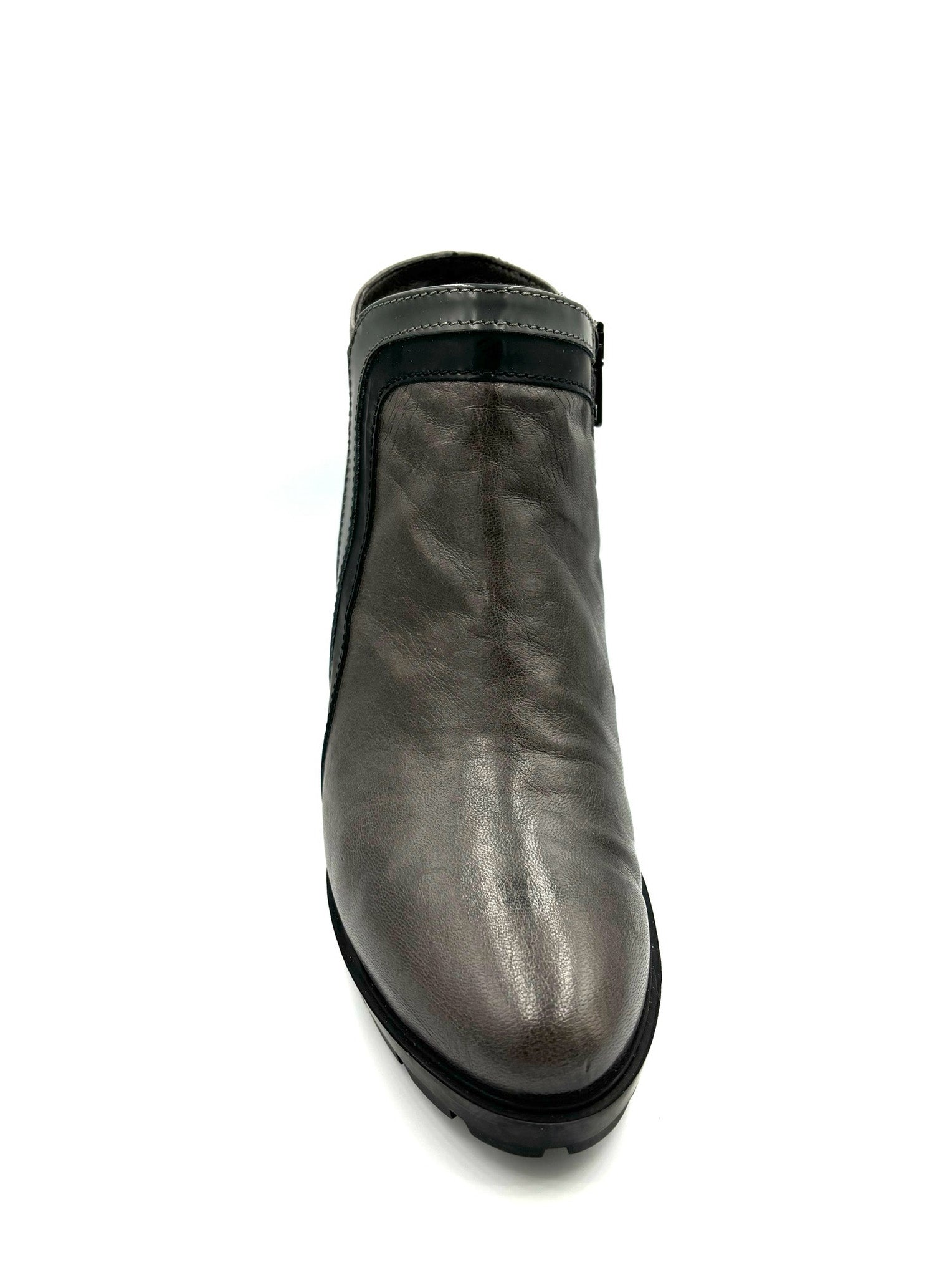 Stivaletto con tacco in pelle liscia grigia. Prodotto italiano. Suola completamente in gomma, tacco 8cm e plateau 2cm.
