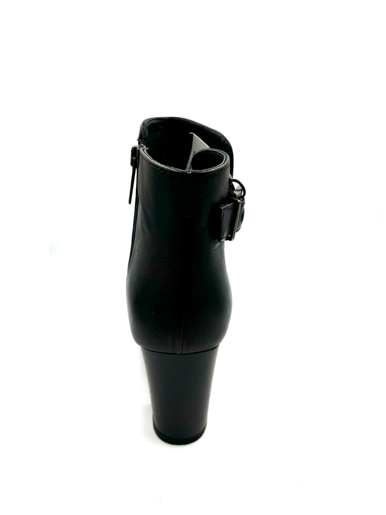 stivaletto con tacco in pelle liscia nera. Con fibbietta esterna per arricchire e dare luce alla scarpa e cerniera interna. Prodotto italiano. Suola in gomma, tacco 7cm.