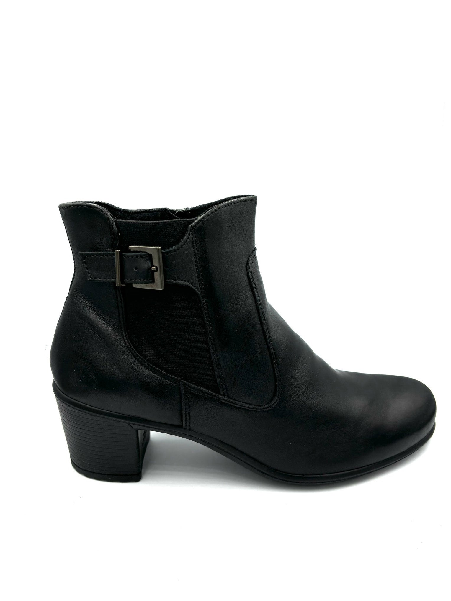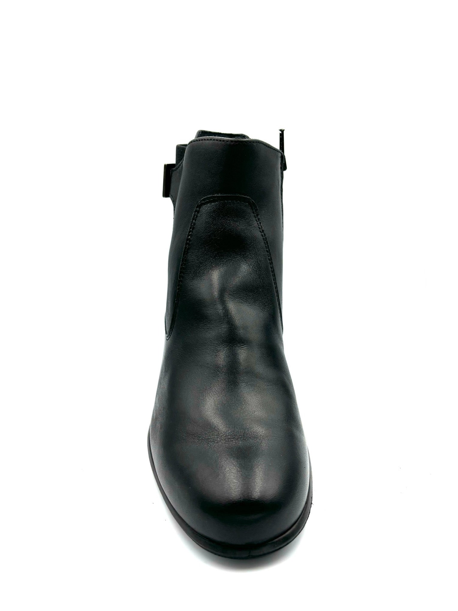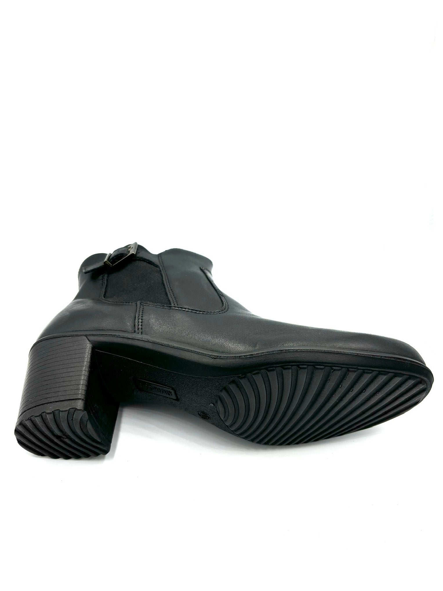 Scarpa da donna in pelle italiana con tacco di 5 cm e base antirumore in gomma, elegante e confortevole, realizzata in Italia. Con fibbia laterale che impreziosisce la scarpa a cerniera interna