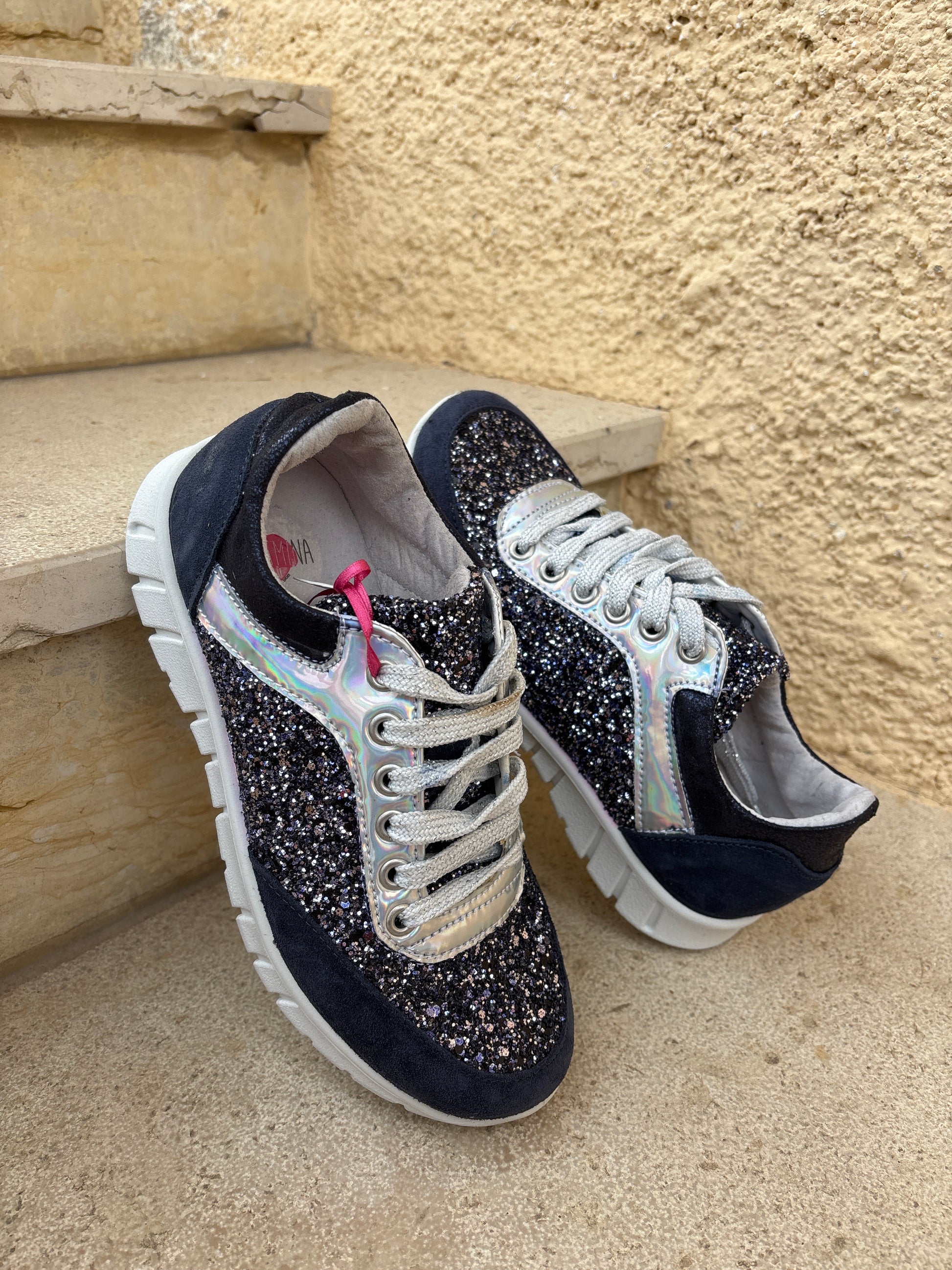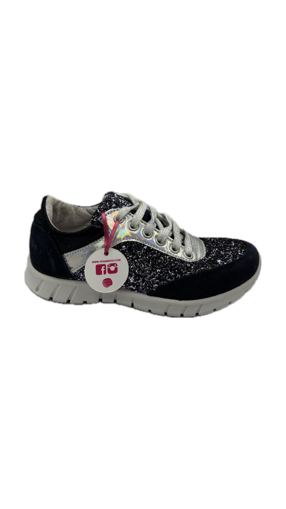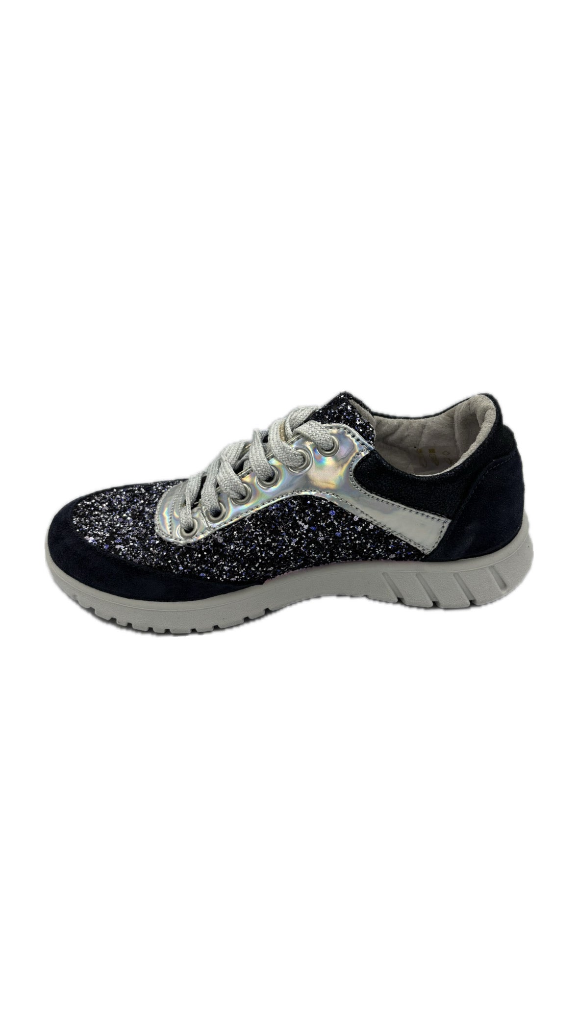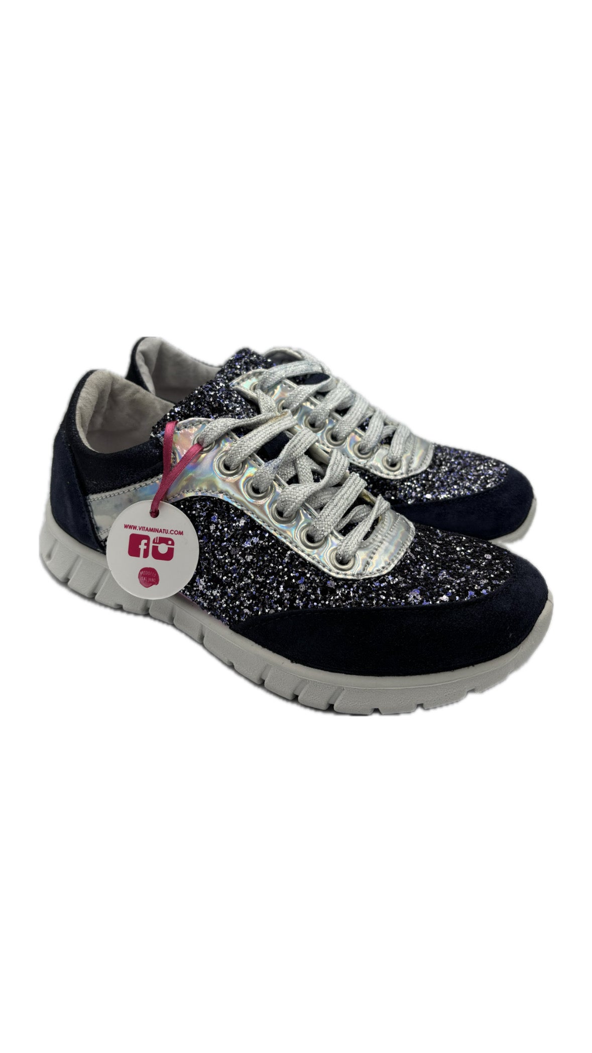 Sneakers in colorazione blu con paillettes. Suola Bianca molto confortevole. Prodotto italiano.
