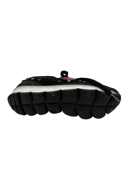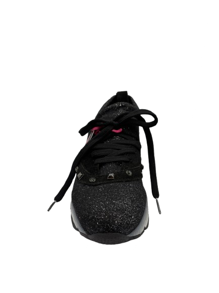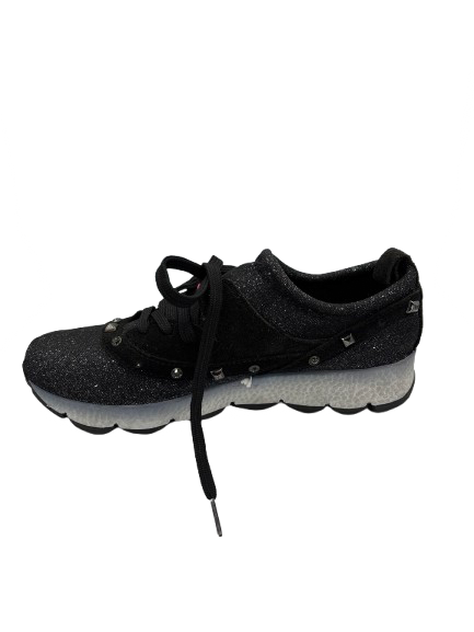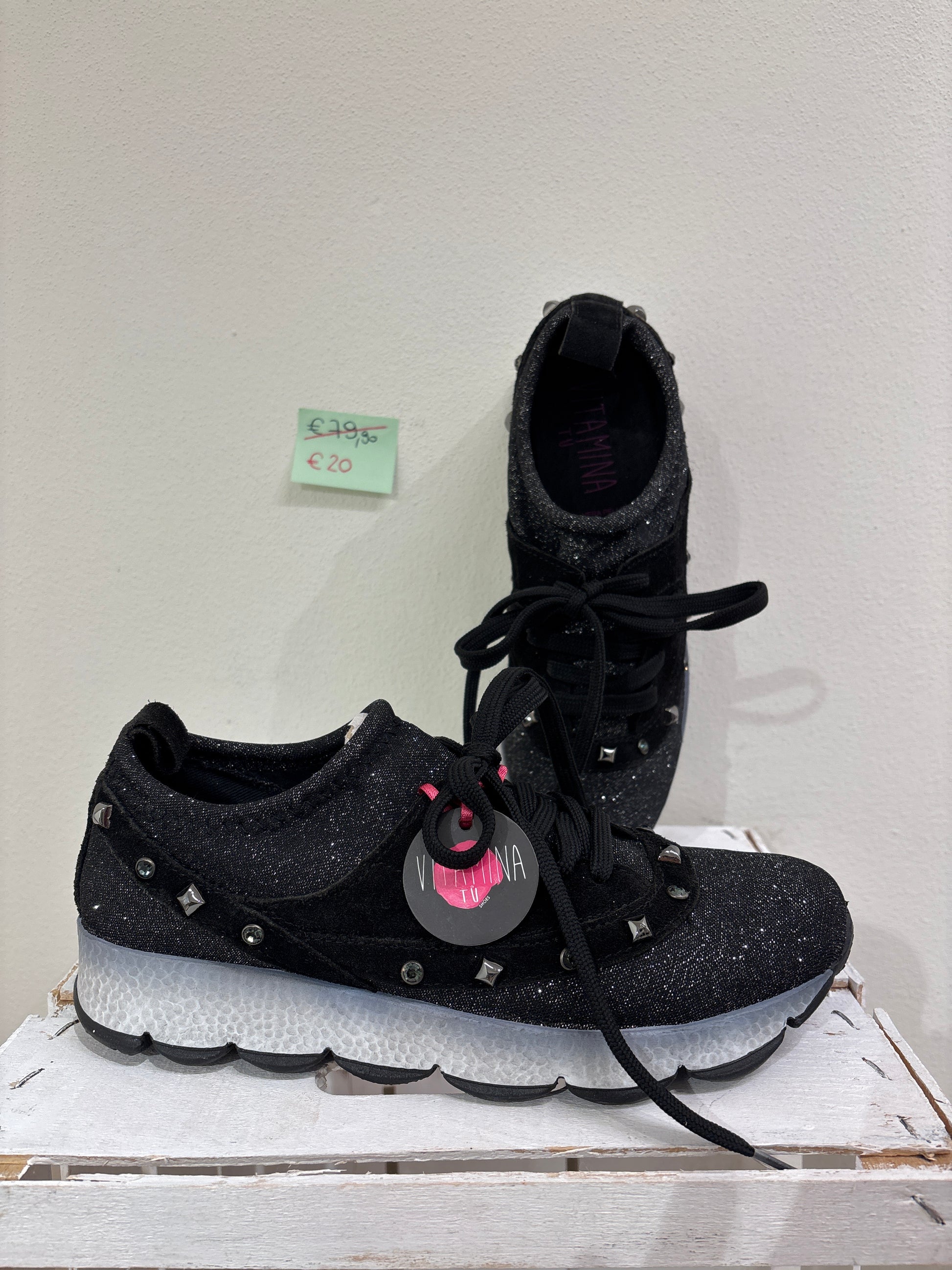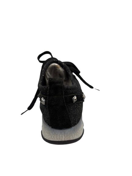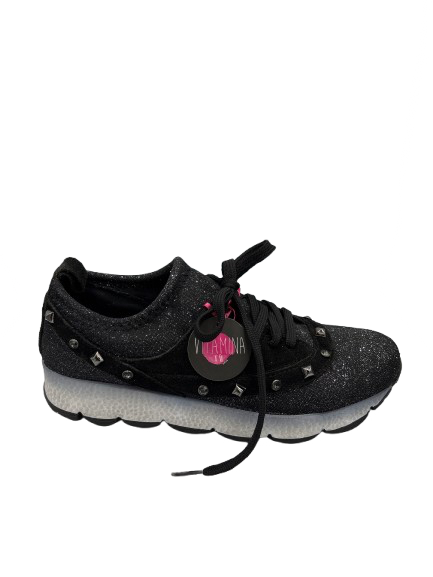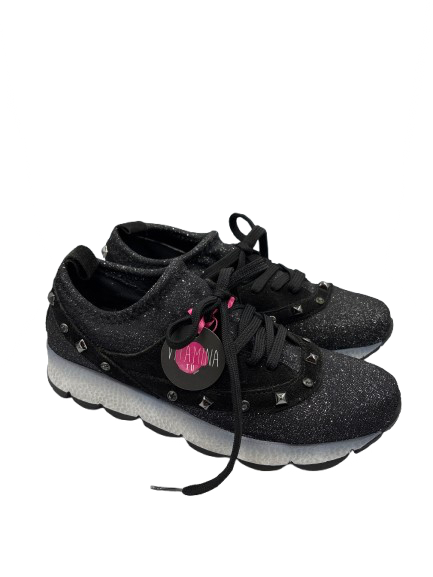 Scarpa slip On con lacci decorativi. Suola molto ammortizzata. Tomaia in tessuto brillantina, nato con borchiette decorative. Adatta per chi è sempre di fretta, vista la facilità di calzata. Adatta per chi fa fatica ad infilare le scarpe.