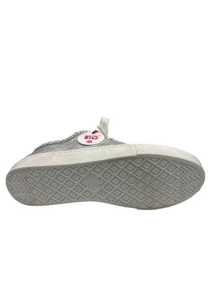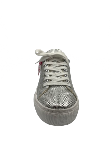 Scarpa prodotta completamente in Italia in eco pelle laminata argento. Con catena che dà luce al tuo out outfit. Adatta per tutti i giorni grazie alla sua comodità.