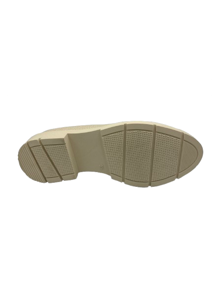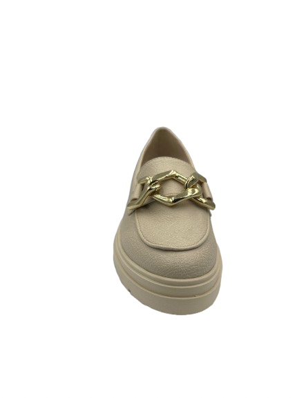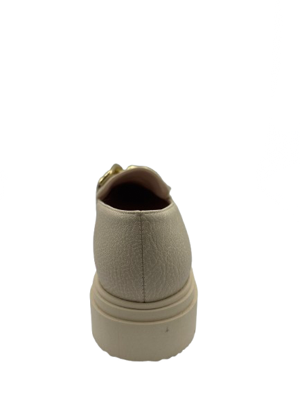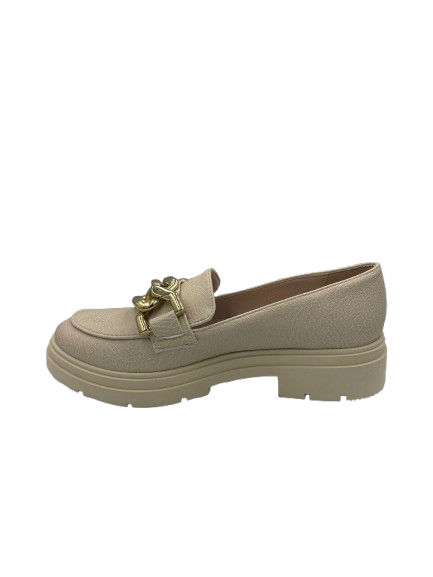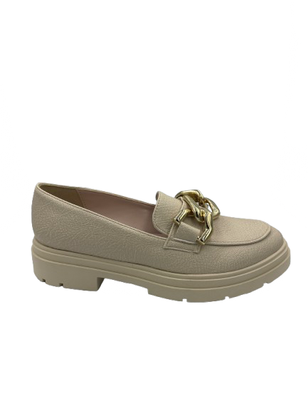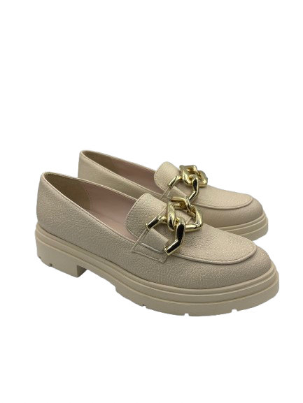 Mocassino in color burro in pelle e prodotto in Italia. Suola in gomma carroarmato molto giovanile. Dettagli in oro molto eleganti.