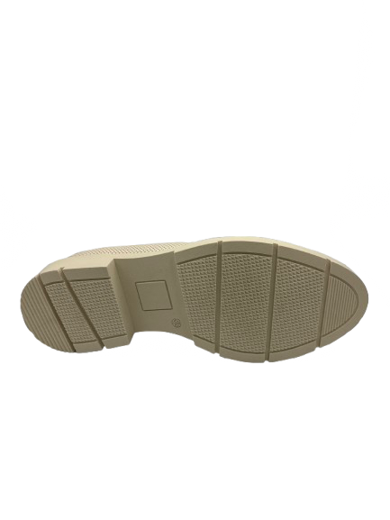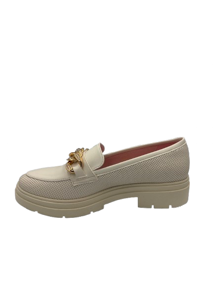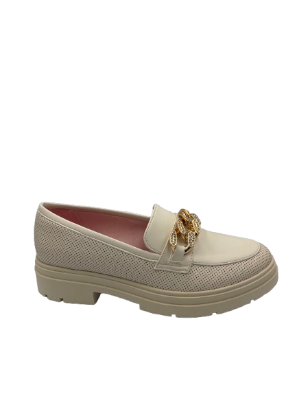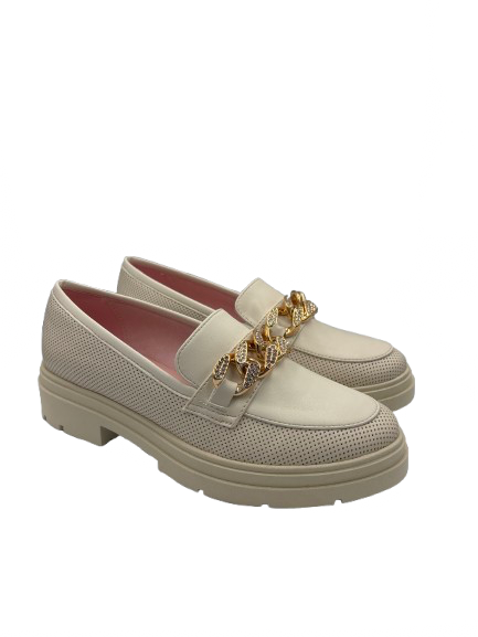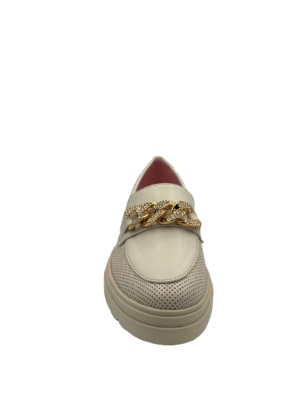 Mocassino in color panna, completamente in pelle e prodotto italiano, con dettagli in oro e brillantini che impreziosiscono ogni outfit. Con suola in carroarmato 5 cm e plateau di 3 cm