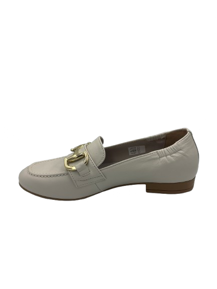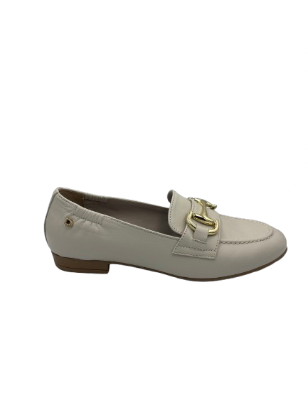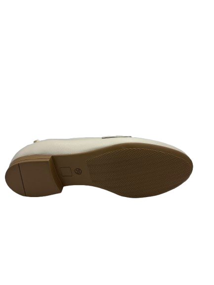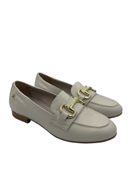 Mocassino color burro con dettagli oro che impreziosiscono la semplicità della scarpa. Con suola bassa e tacchetto di 3 cm. Molto morbida completamente in pelle e prodotto in Italia.