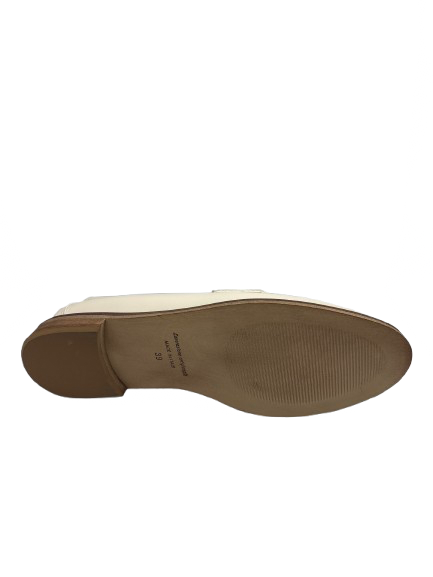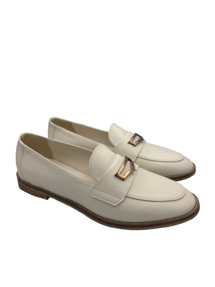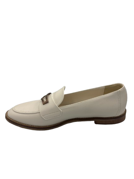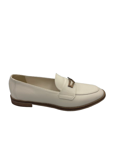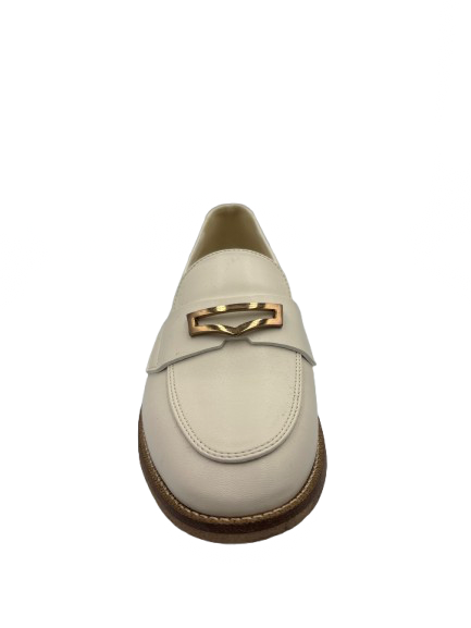 Mocassino bianco con dettagli in oro. Suola in cuoio con tacco in gomma. Prodotto italiano e lavorazione artigianale. Per dare il tocco di stile al tuo outfit.