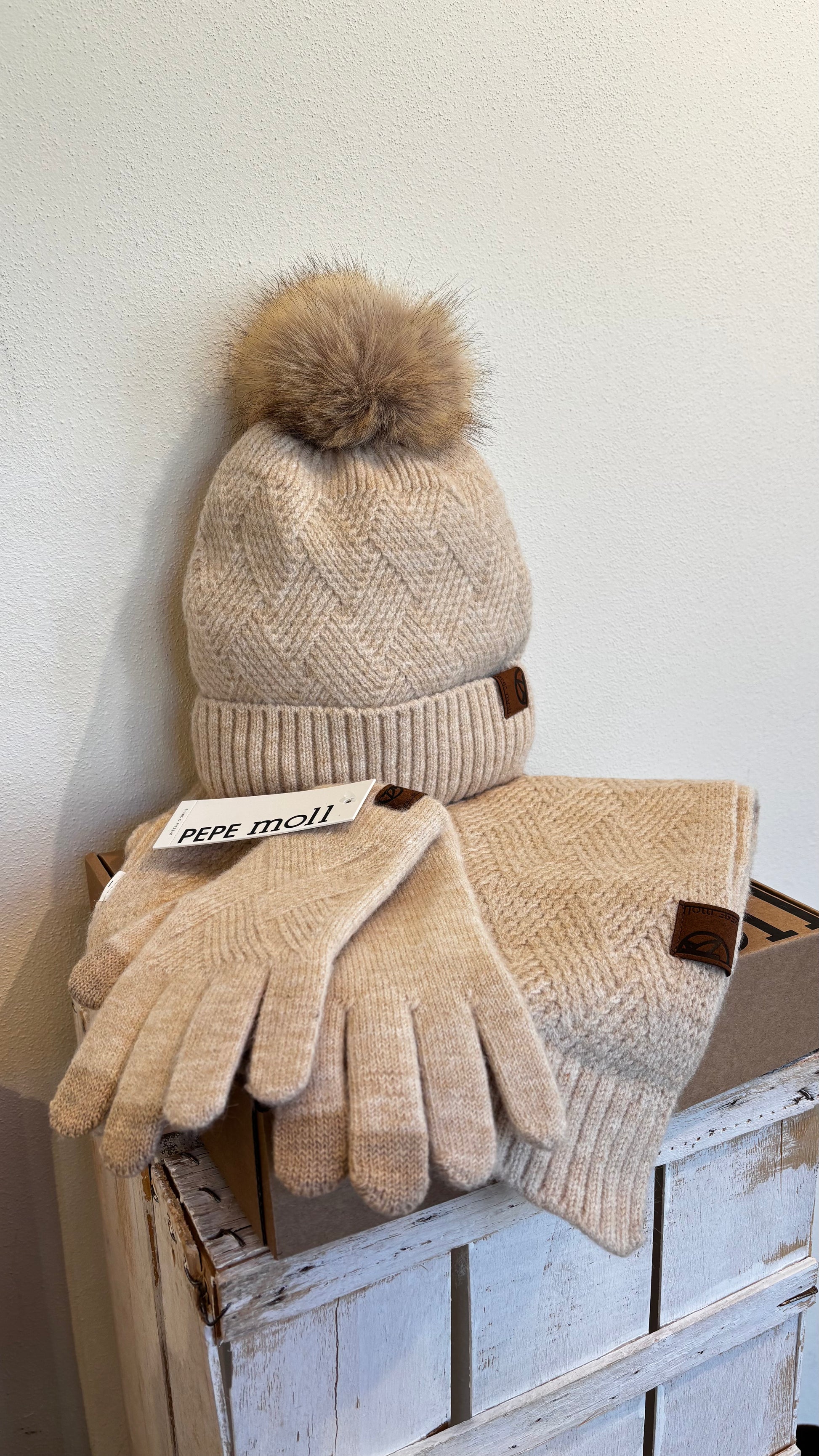 Set beige: sciarpa + guanti + cappello con pelo